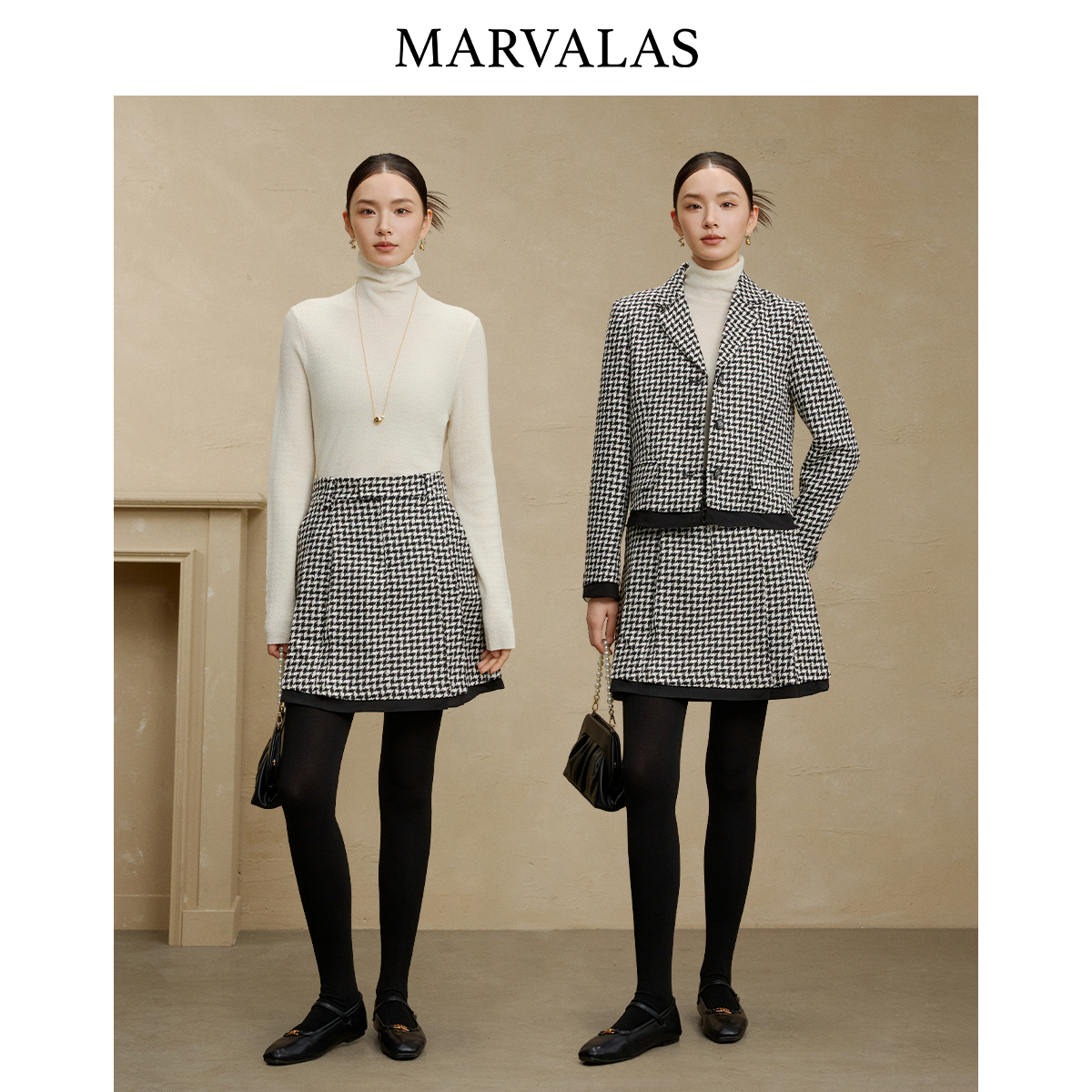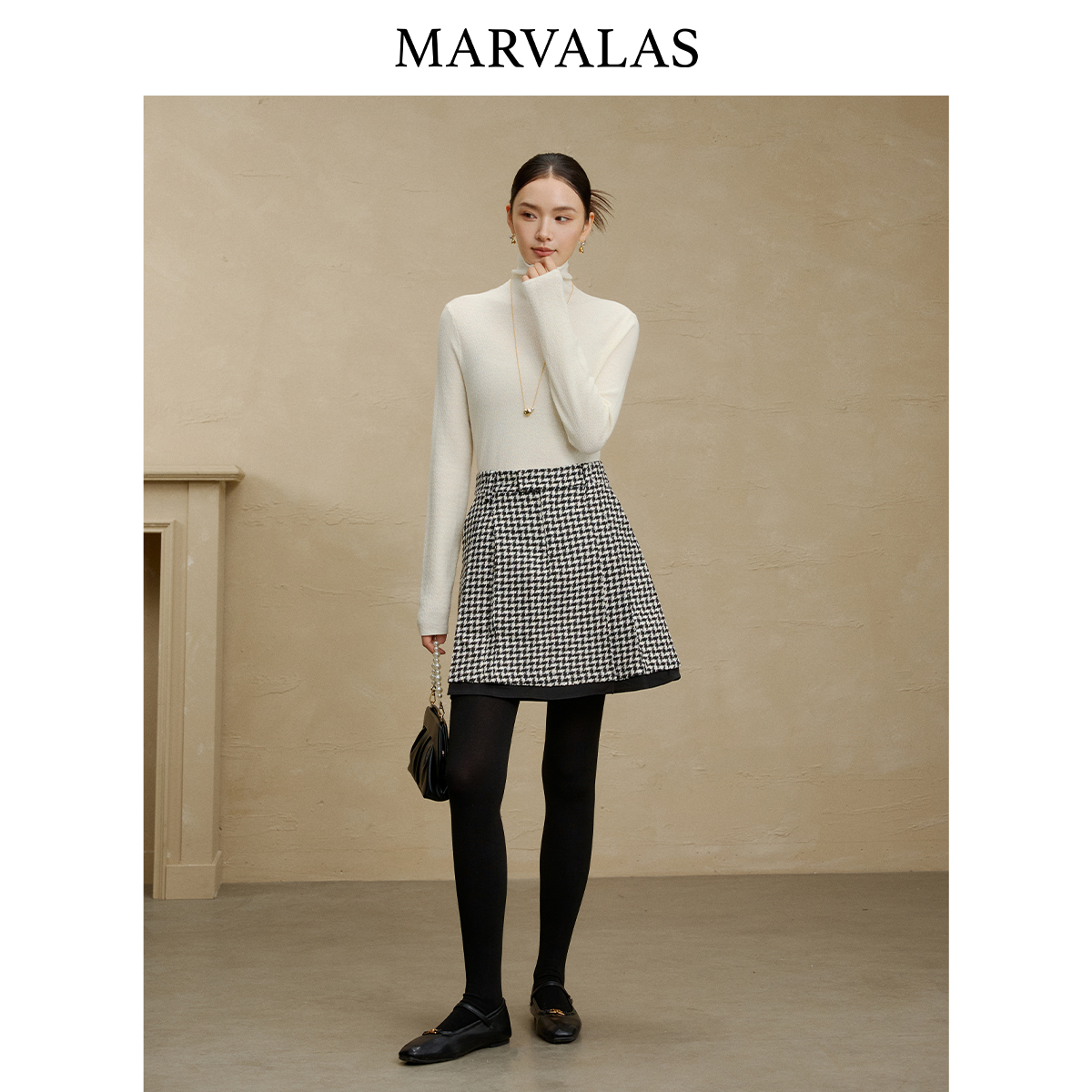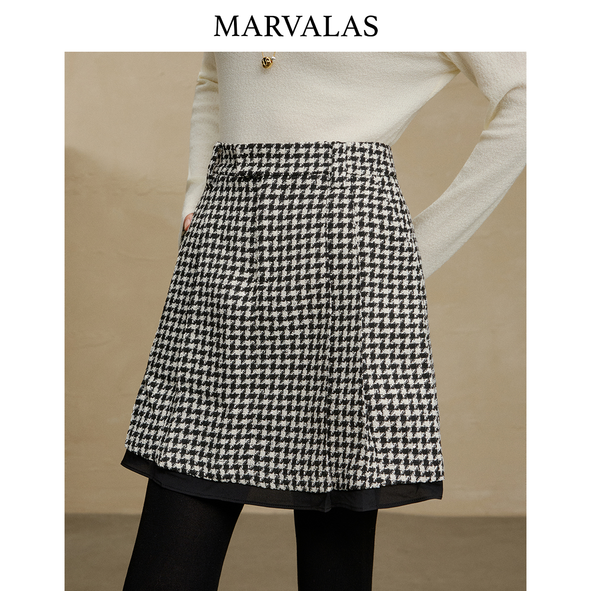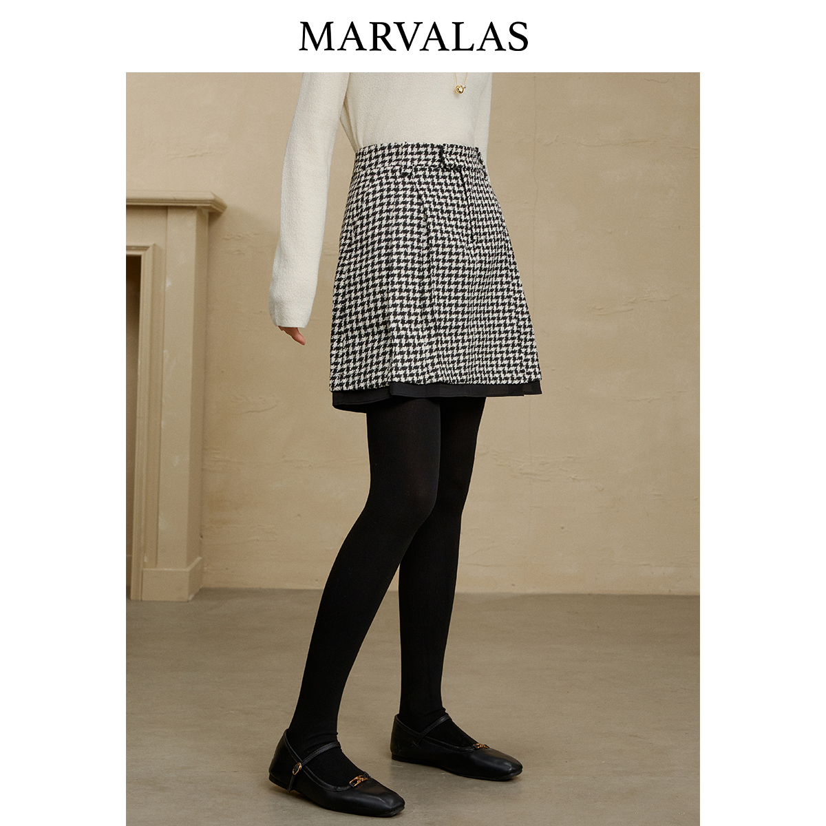 曼德诗撞色半身裙2025冬季新款黑白千鸟格短裙气质百搭通勤A字裙