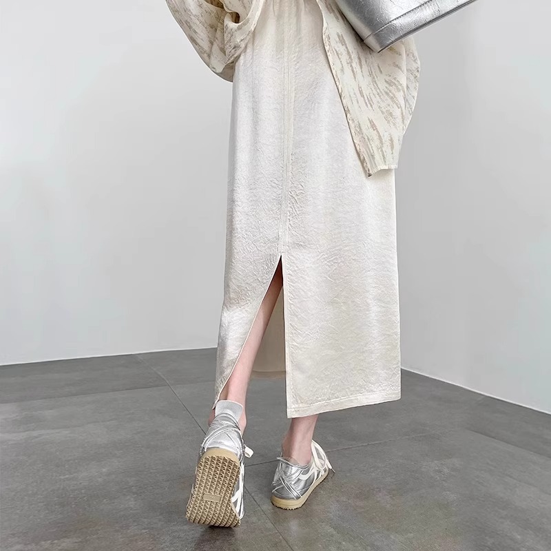 醋酸半身裙女夏季新款2025 大码中长款垂感开叉包臀缎面a字直筒裙