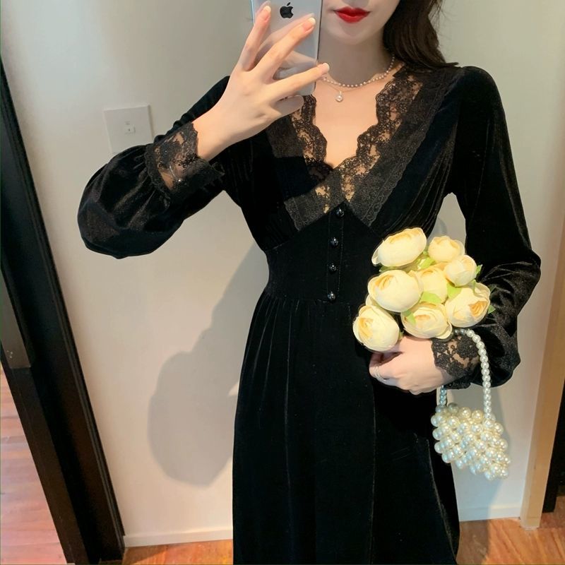 秋冬2025年新款气质女装法式赫本风长袖V领大码黑色金丝绒连衣裙