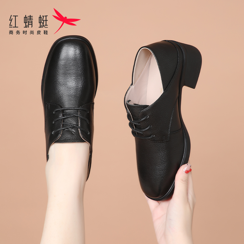 红蜻蜓女鞋真皮深口高跟小皮鞋秋季新款英伦软底粗跟厚底妈妈单鞋