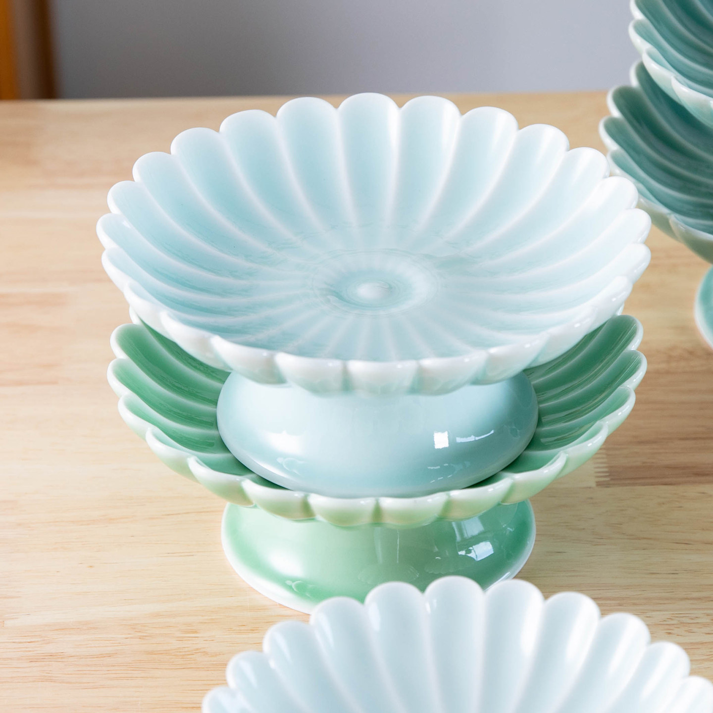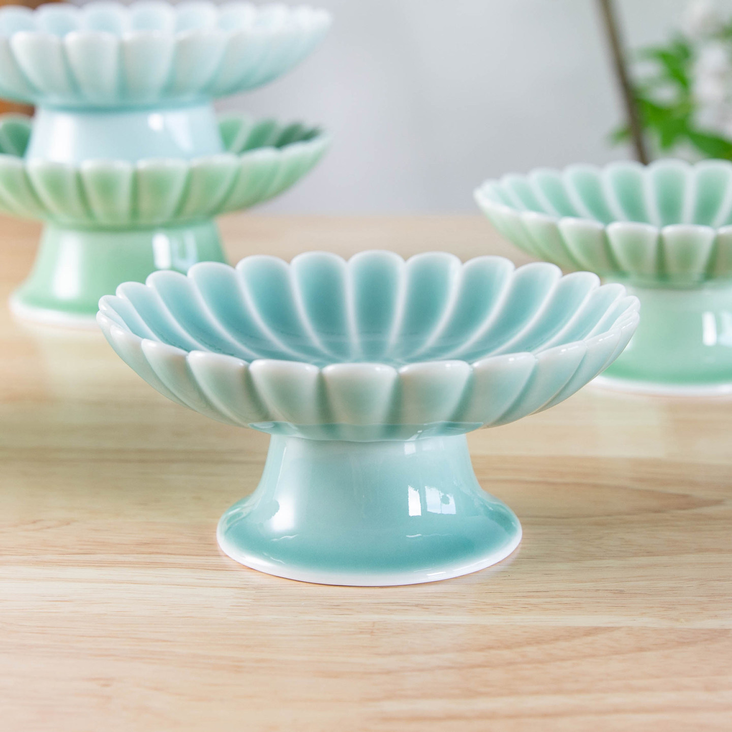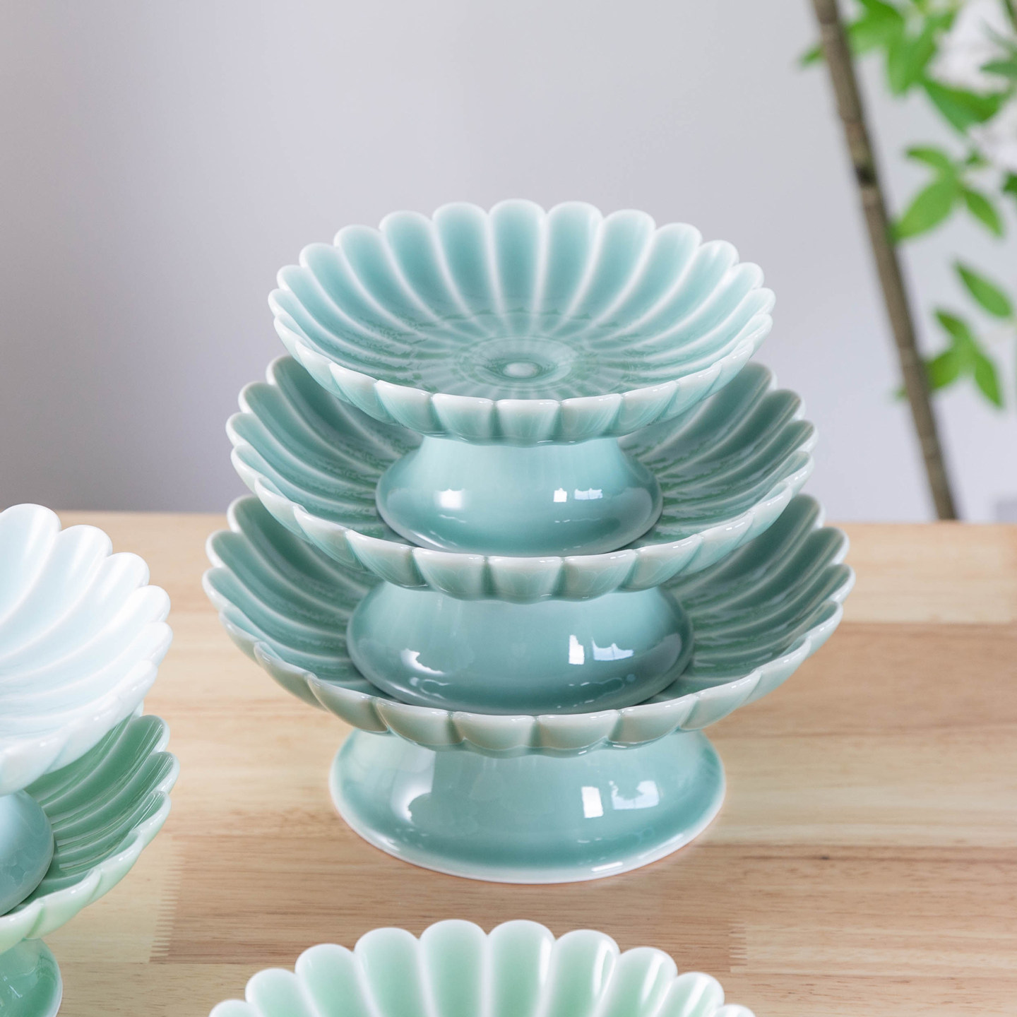 青瓷高脚果盘点心盘家用陶瓷高足盘子创意花瓣高脚盘中式佛前贡盘