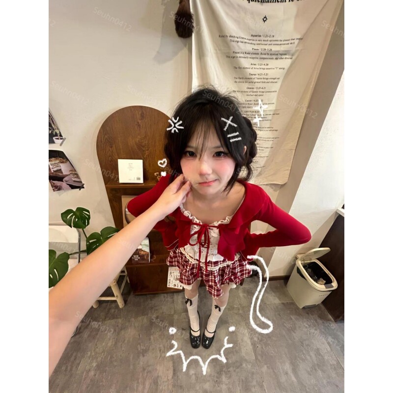 早秋甜美少女感学院风红色开衫外套蕾丝拼接吊带背心蛋糕裙三件套