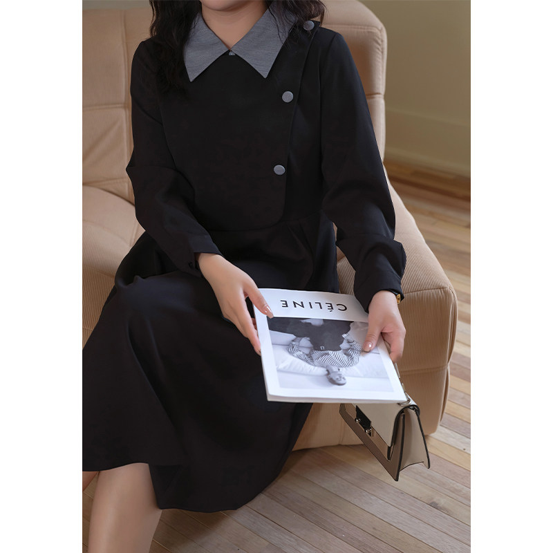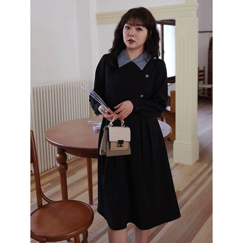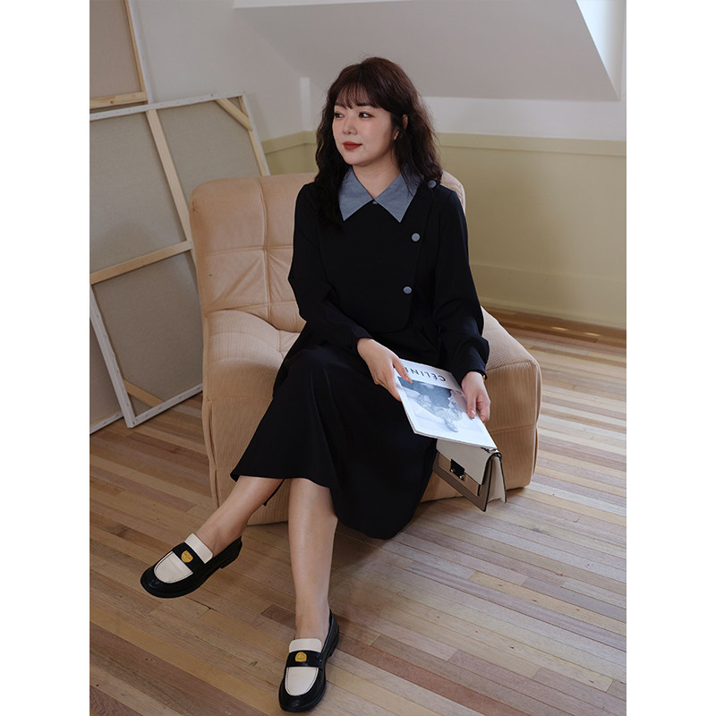 蓝若水大码女装法式高端假两件连衣裙胖mm春装撞色翻领显瘦长裙