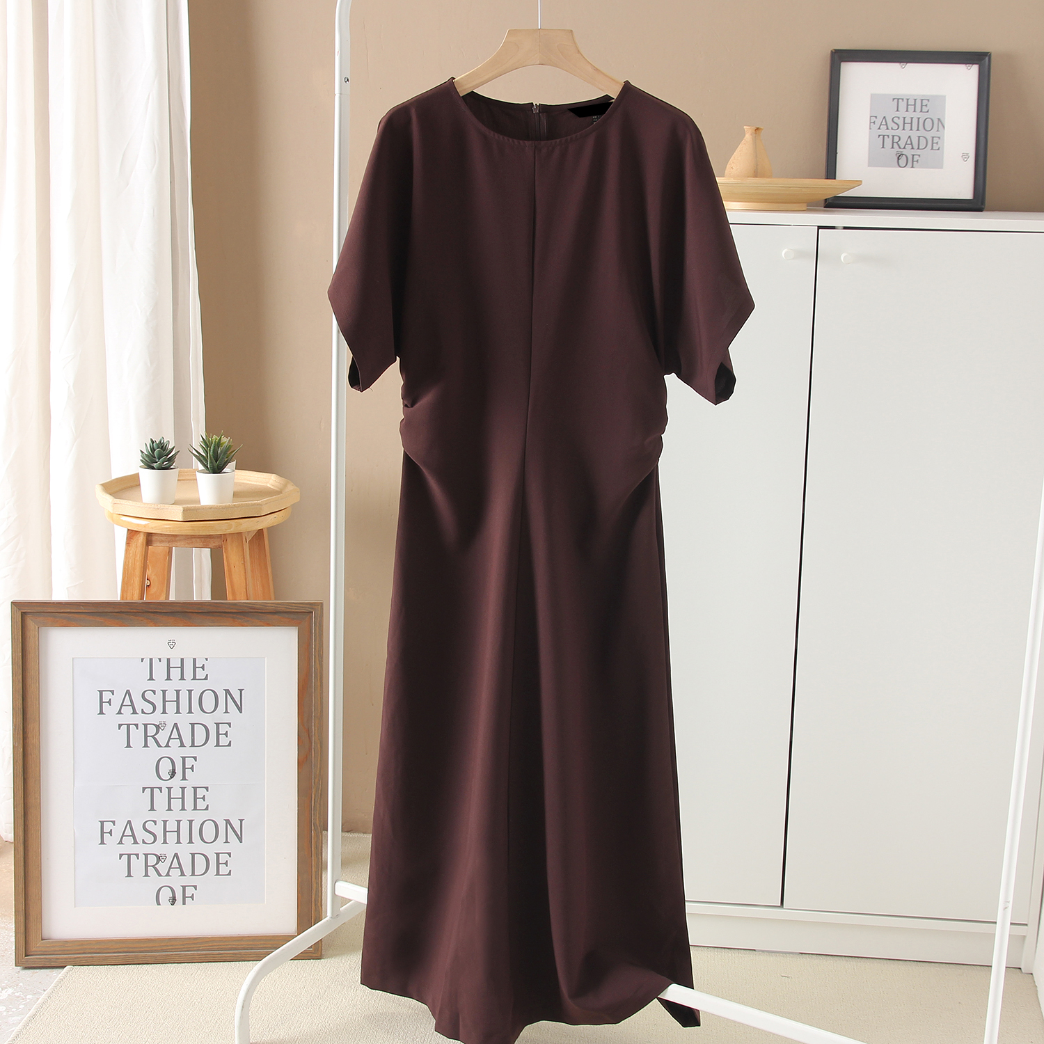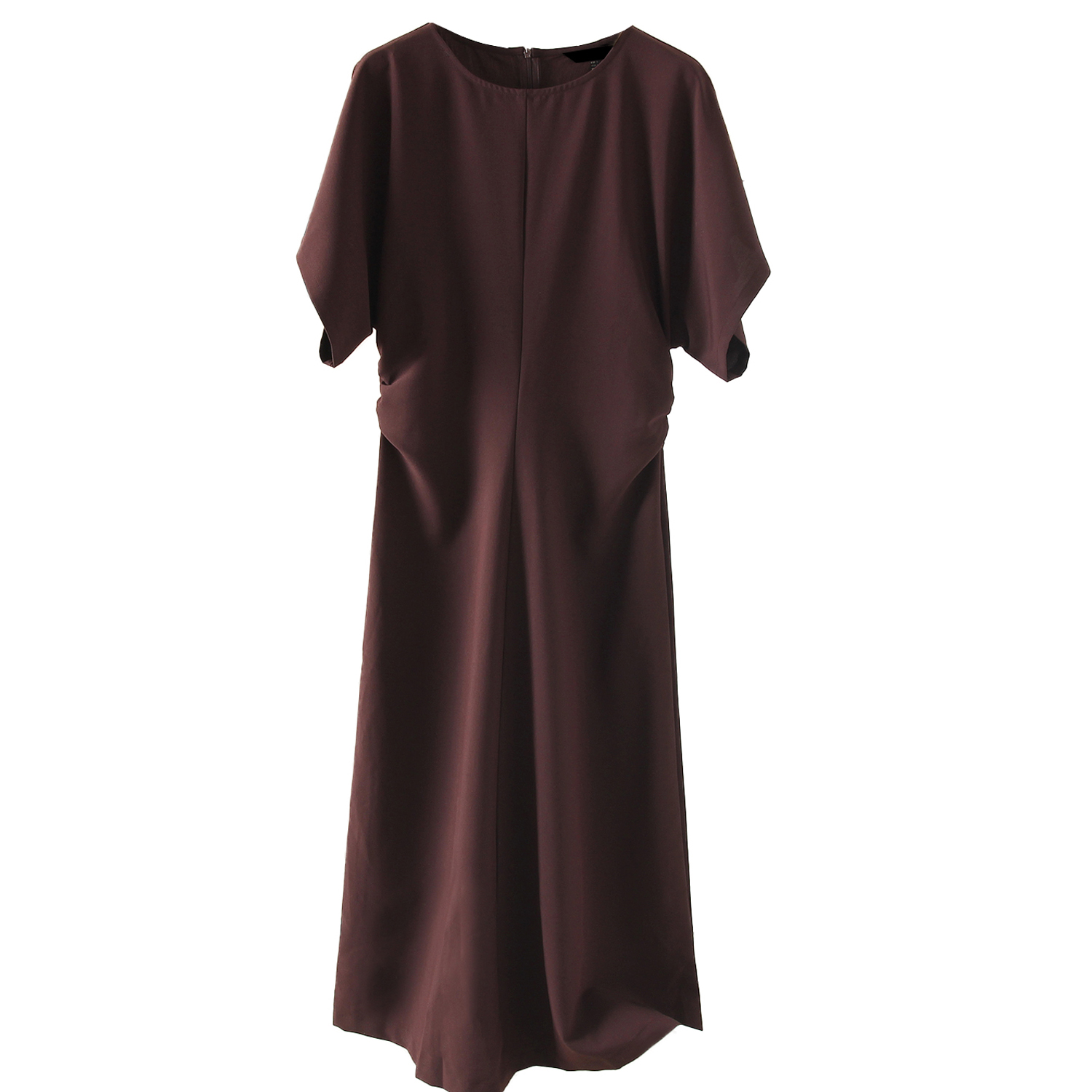 女装 春夏新品气质圆领老钱风优雅收腰缩褶中长款短袖连衣裙T恤裙