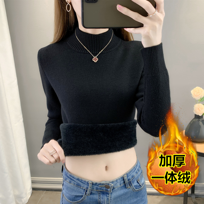 秋冬白色一体绒毛衣女加绒加厚内搭大码半高领针织衫保暖打底上衣