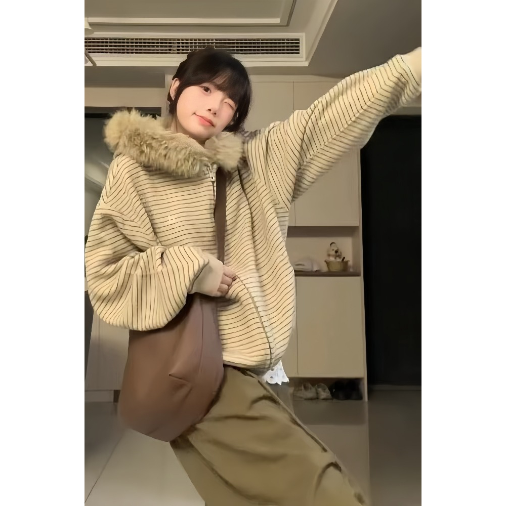 美式复古条纹连帽毛领上衣外套女秋冬设计感慵懒宽松厚款毛衣开衫