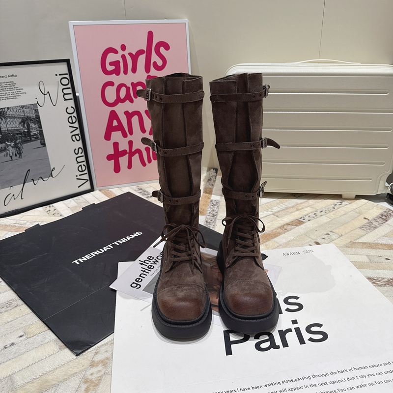 2025秋季新款磨砂真皮长靴女松弛感皮带扣骑士靴西部靴两穿中筒靴