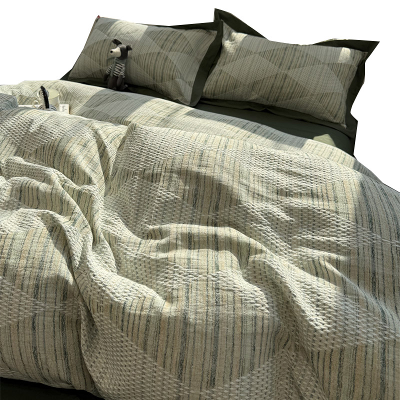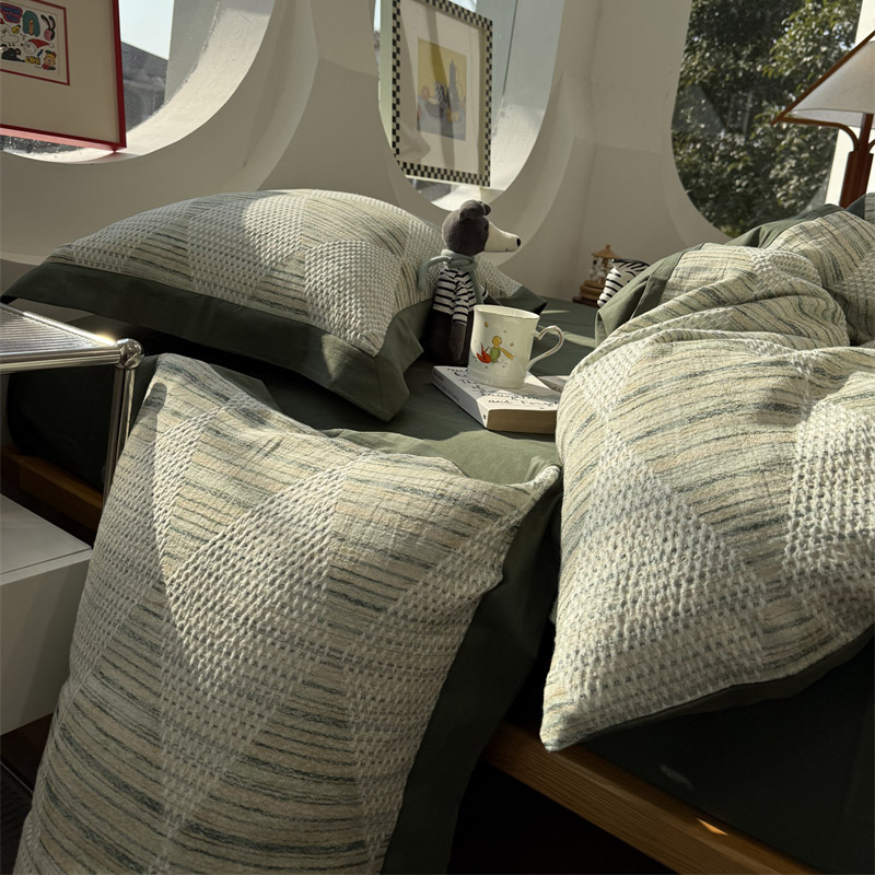ins风简约菱形条纹华夫格绿色四件套1.5m1.8米全纯棉床单被套公寓