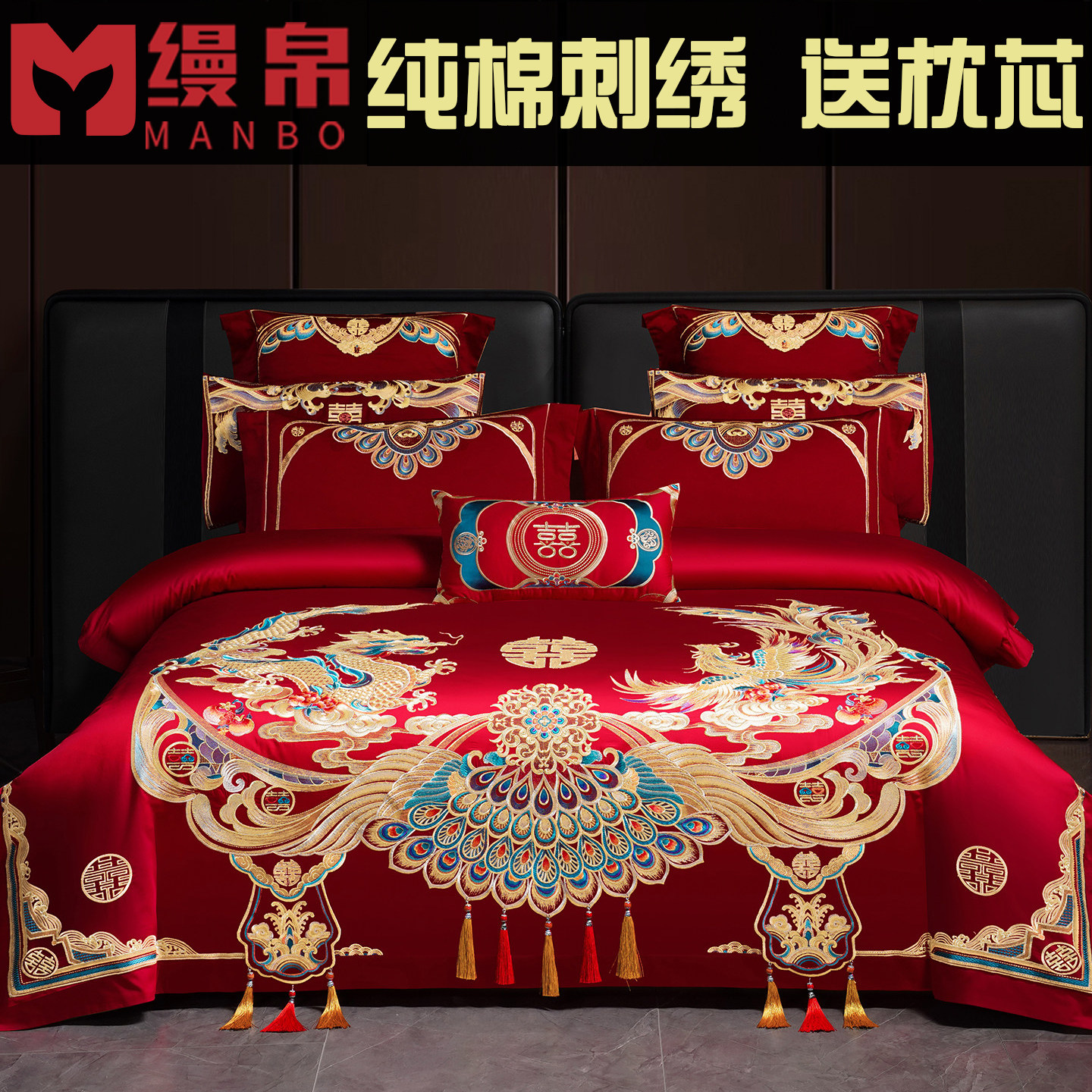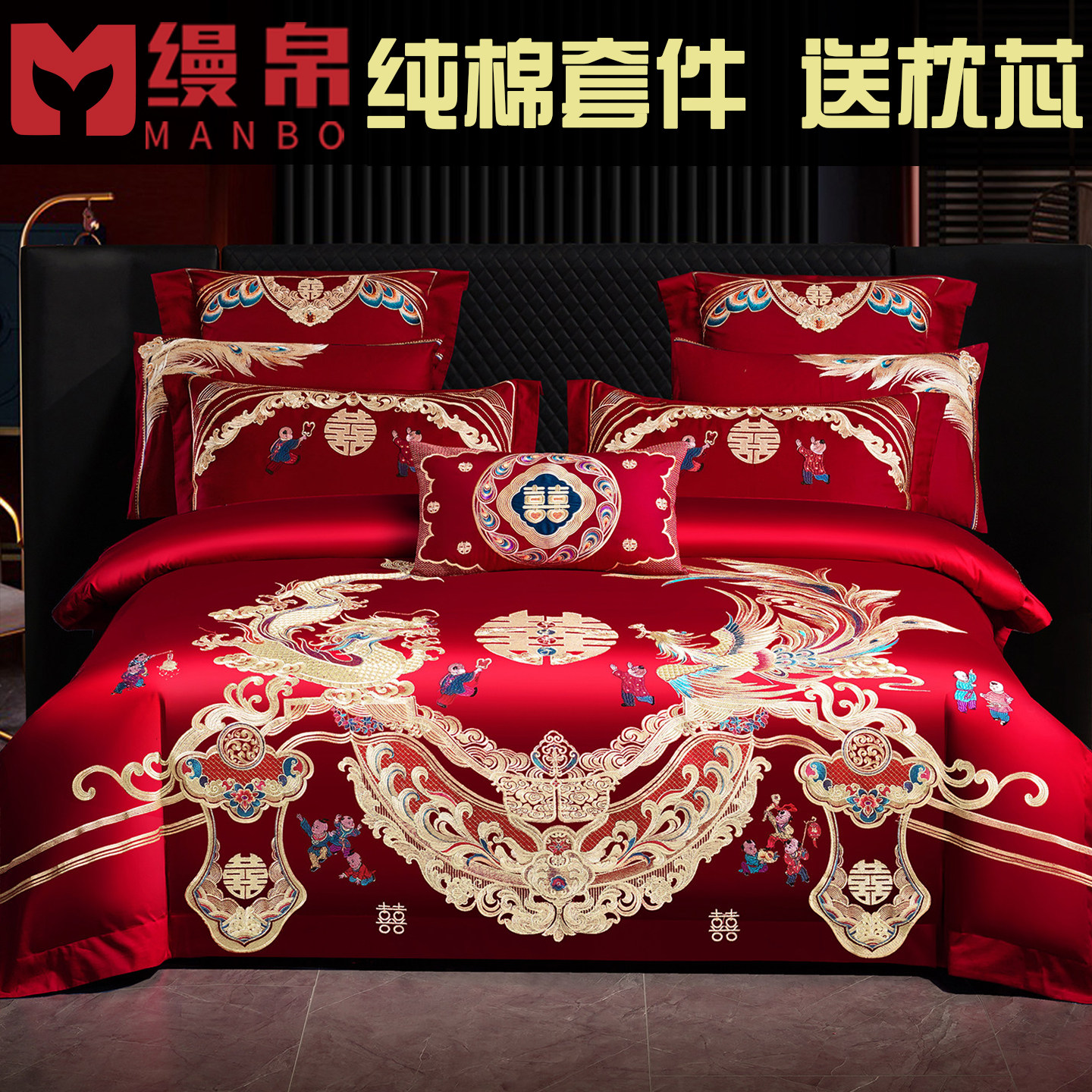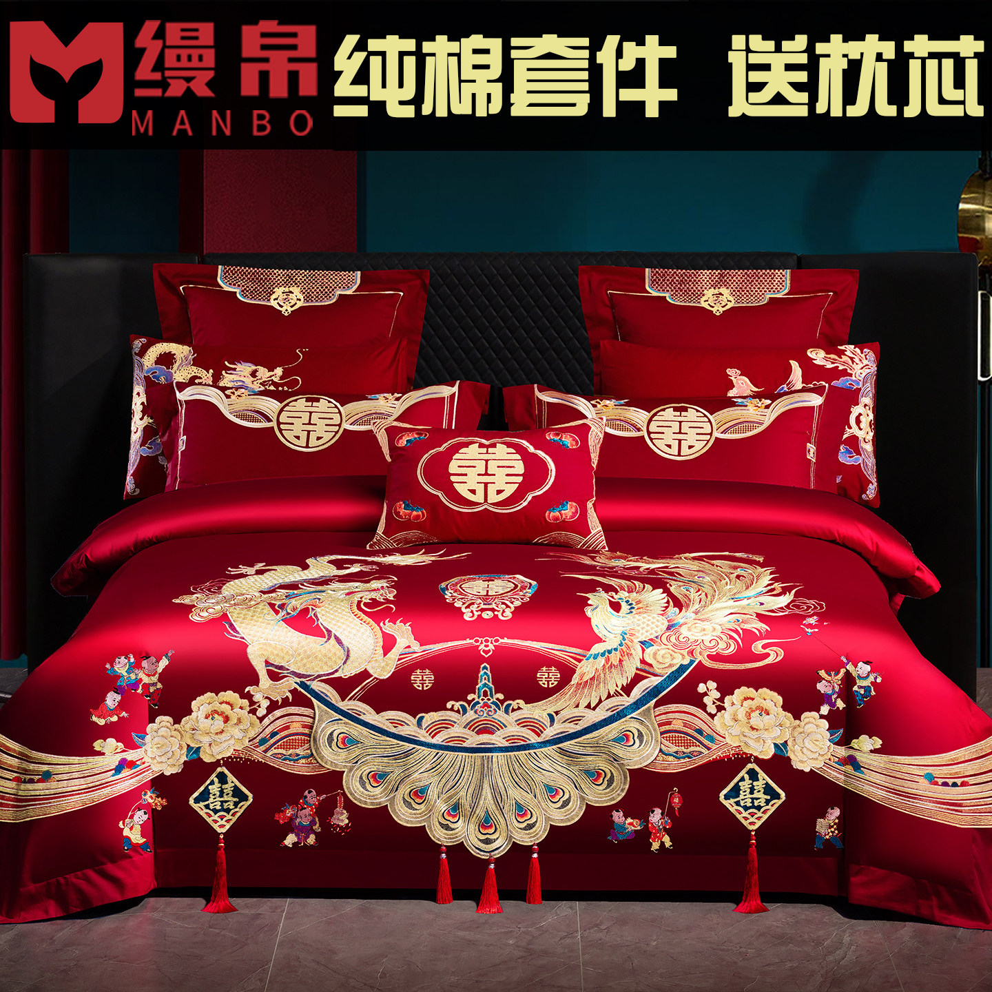 婚庆四件套100%全棉喜庆结婚龙凤床上用品纯棉婚嫁新婚大红色喜被