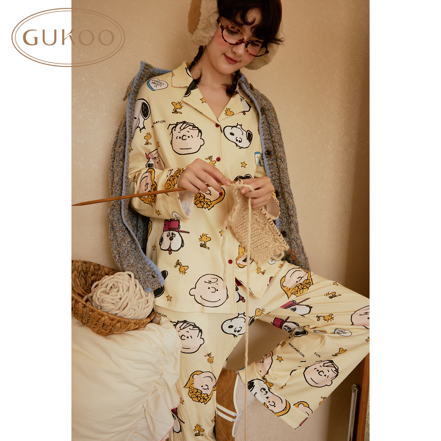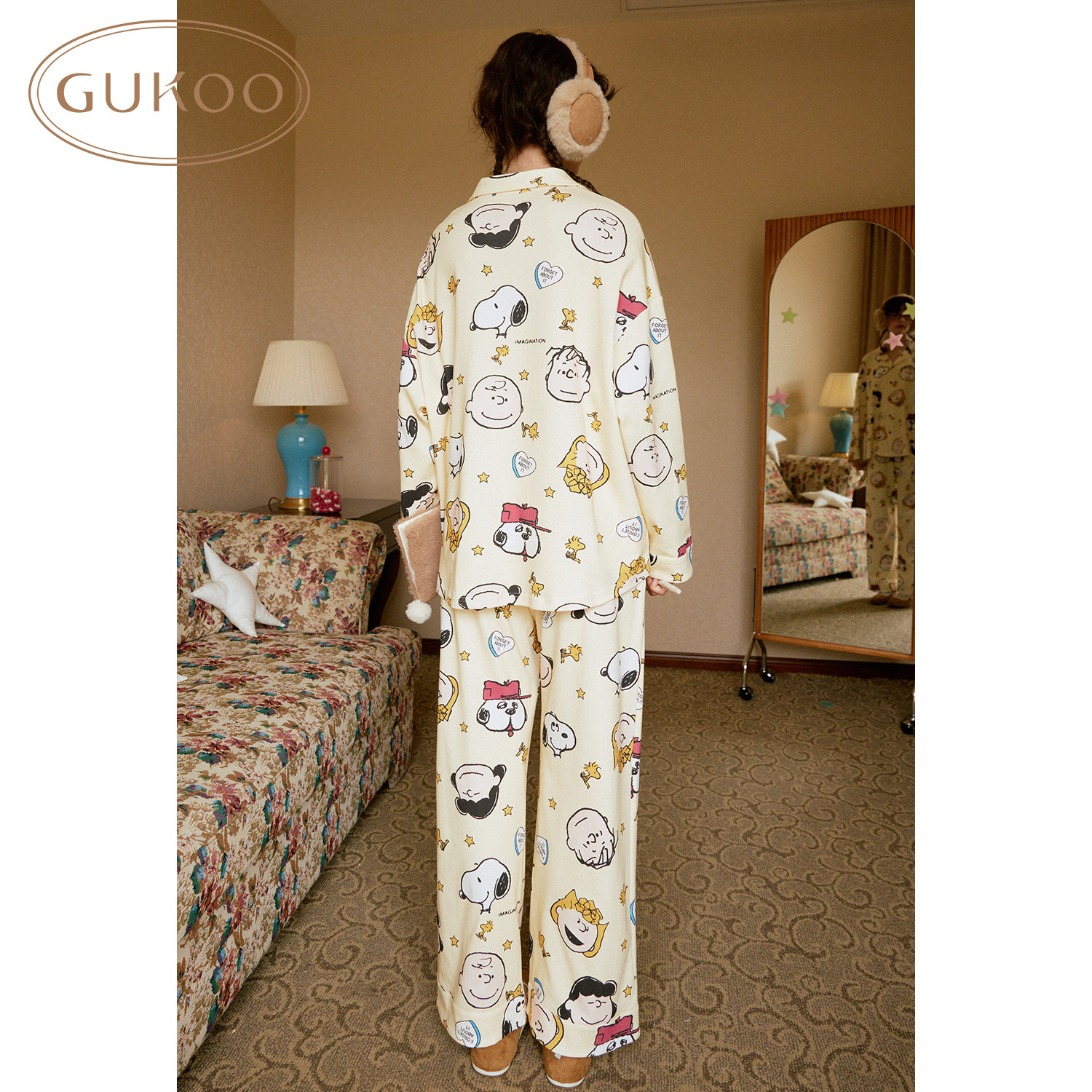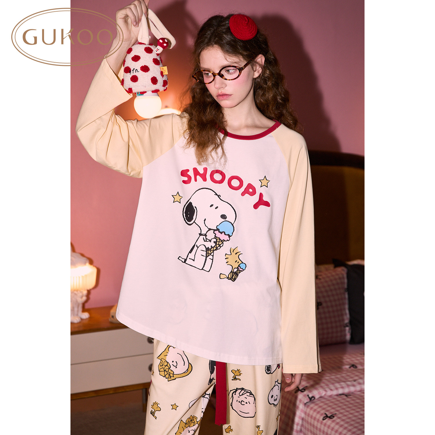 Gukoo/果壳睡衣女春秋款史努比联名新款纯棉满印女士家居服套装C