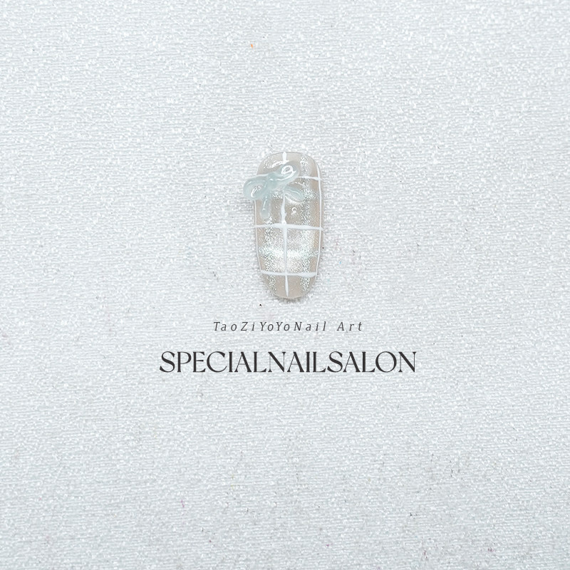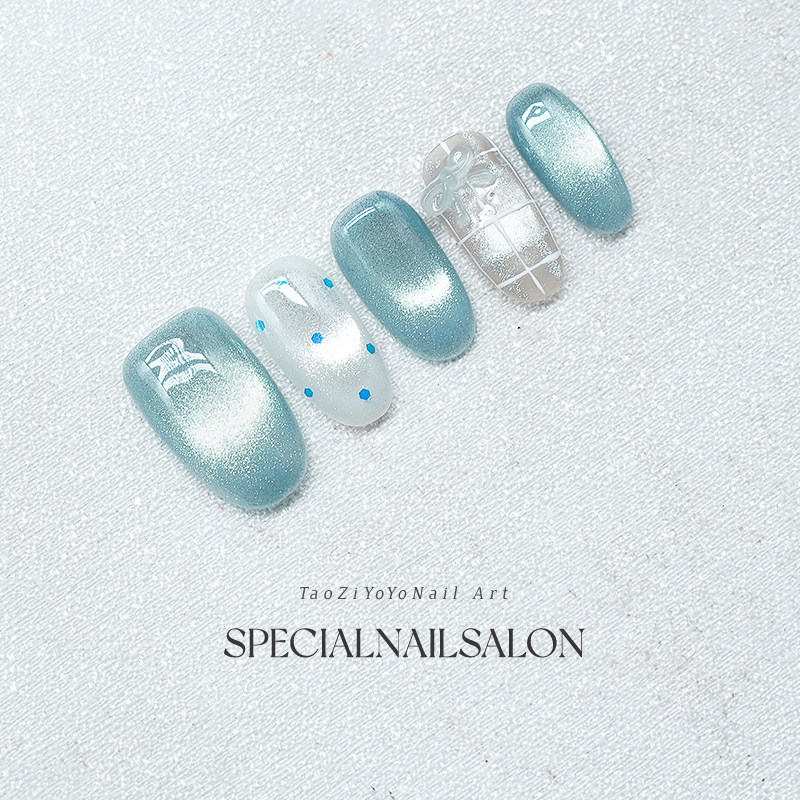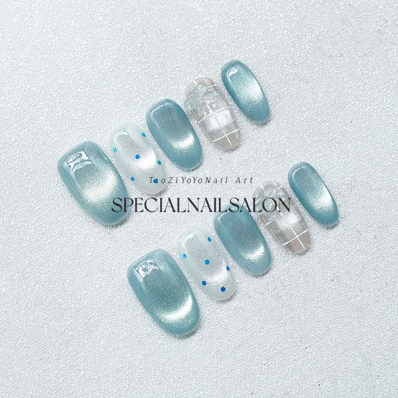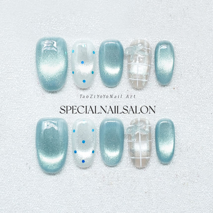 【薄荷冰蝶】纯手工穿戴甲冰蓝色猫眼小清新巨显白美甲贴片高级感