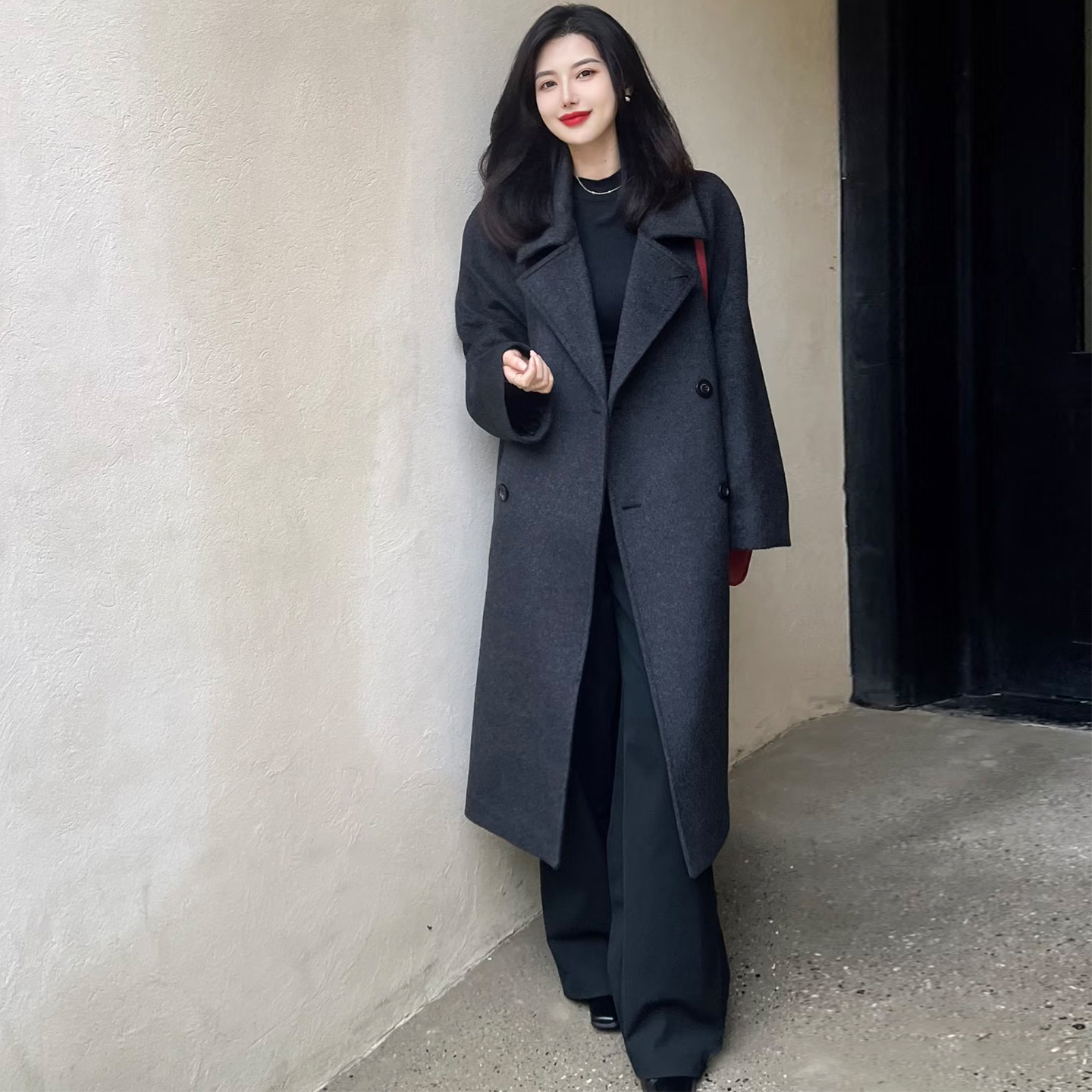 韩系通勤灰色呢子大衣女秋冬新款中长款双排扣高级感气质毛呢外套