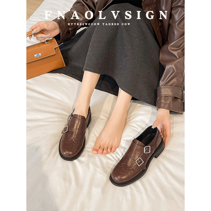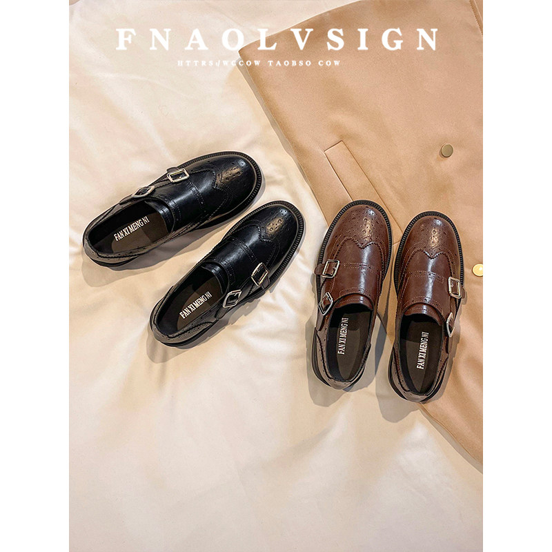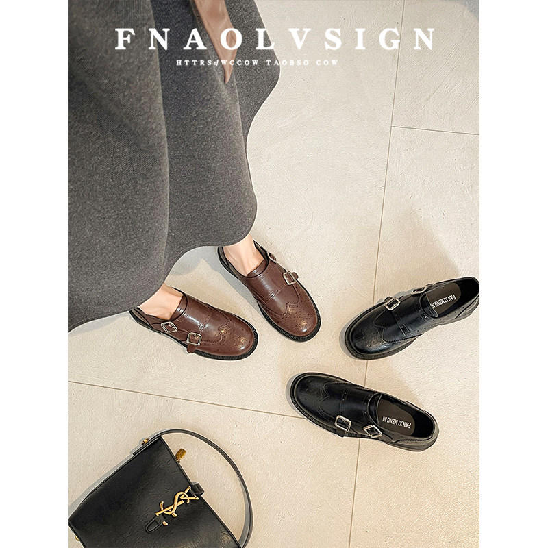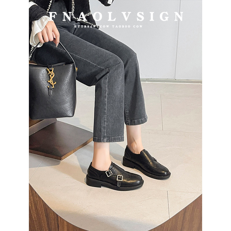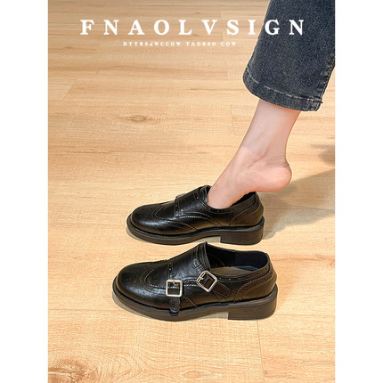 牛皮版~英伦风复古雕花双扣带粗跟乐福鞋女圆头百搭黑色小皮鞋女