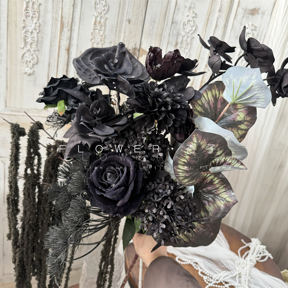 复古哥特黑玫瑰花暗黑红色花束拍照道具枯萎暗红玫瑰万圣节装饰