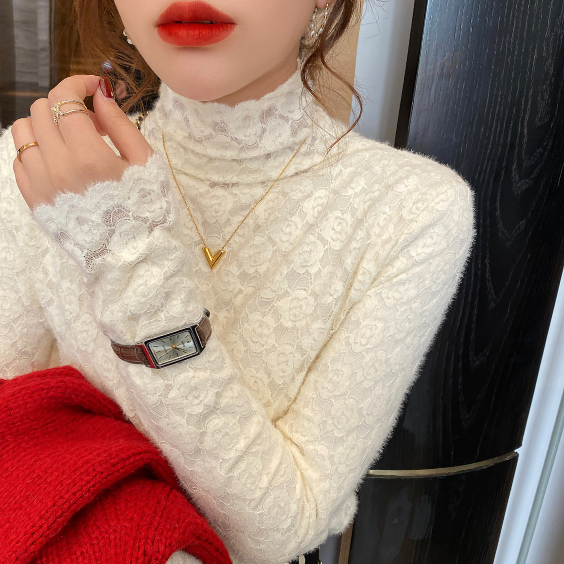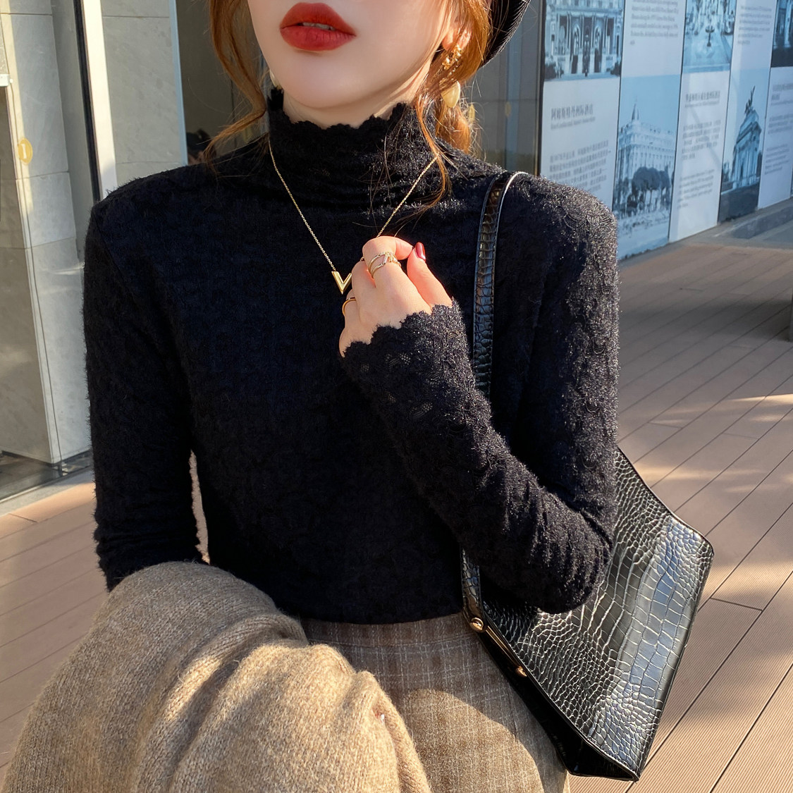 蕾丝打底衫加绒加厚半高领