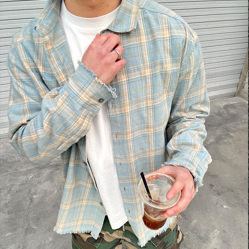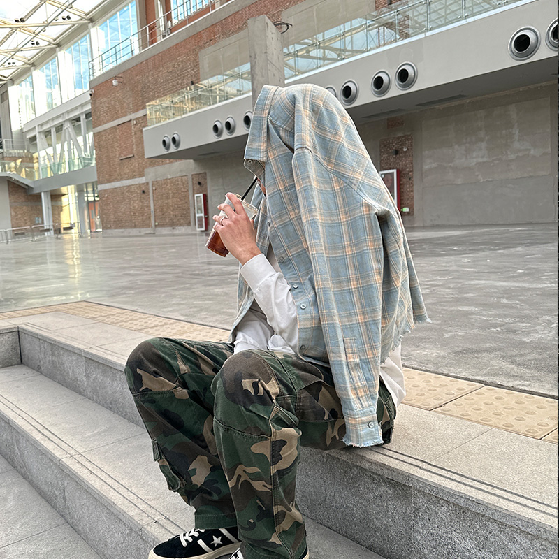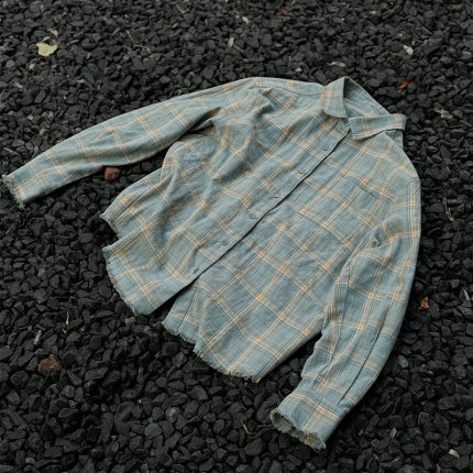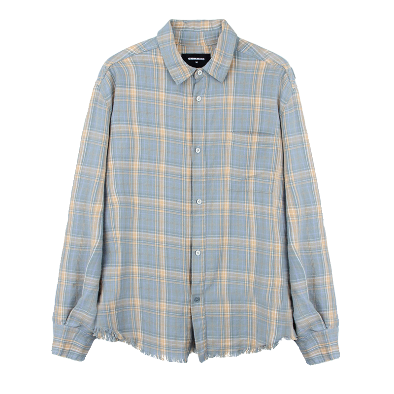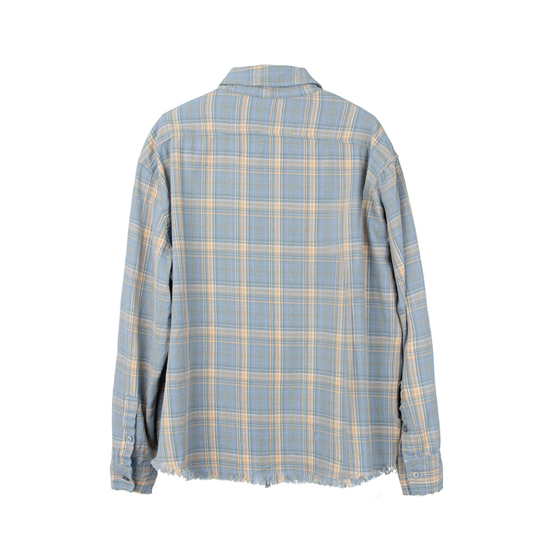 Commas定制蓝黄格纹法兰绒流苏复古长袖格子衬衫休闲纯棉宽松男女