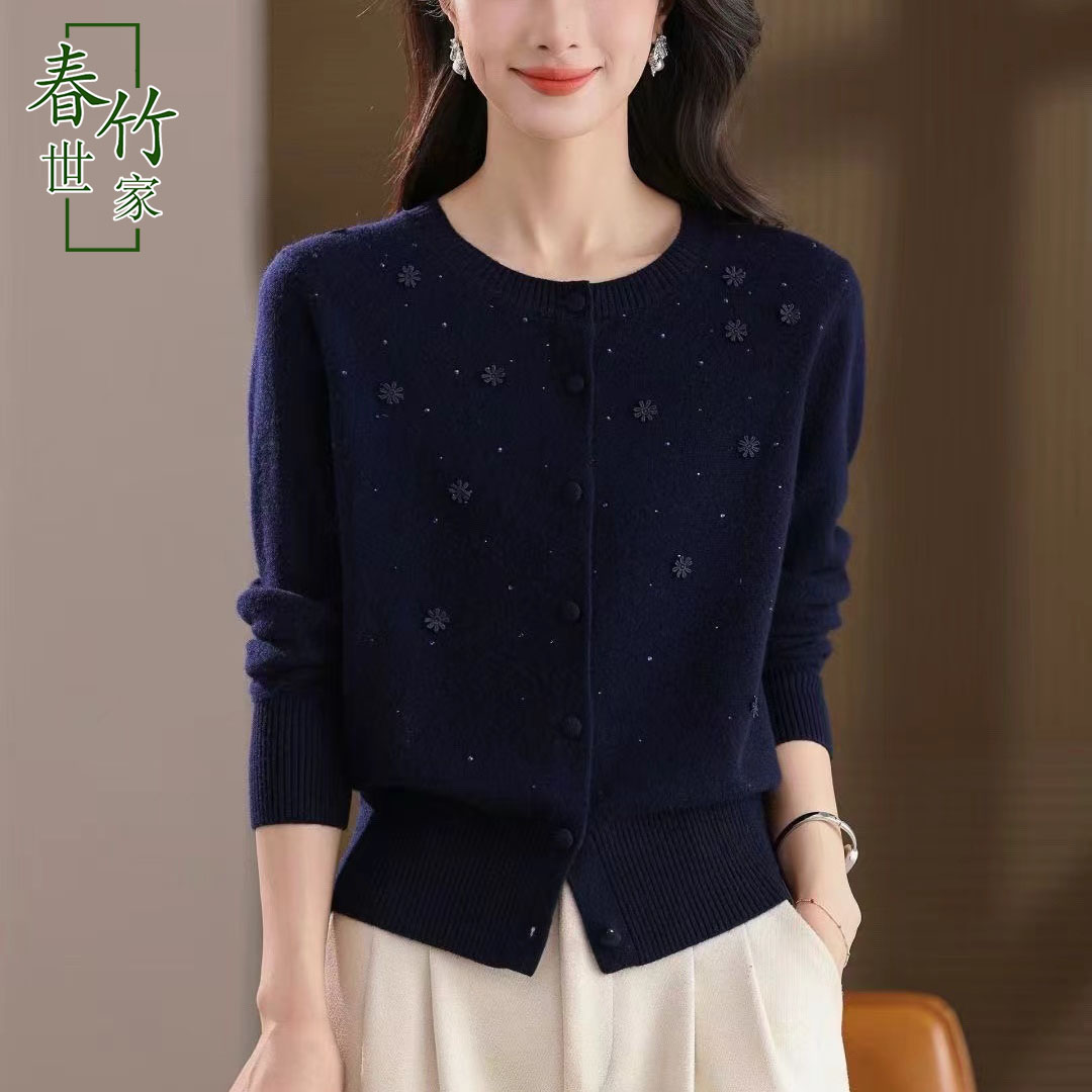 春竹世家秋冬100纯羊毛新款圆领长袖开衫立体小花女士毛衣针织衫