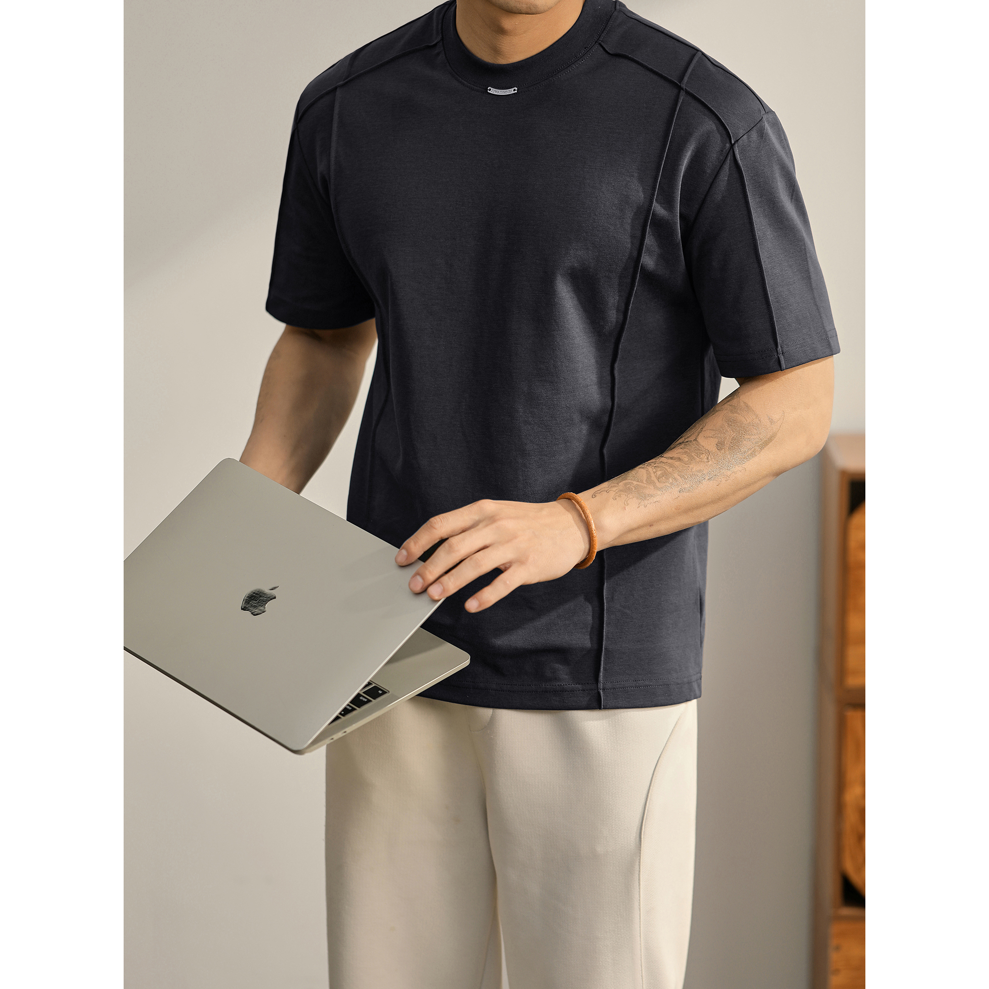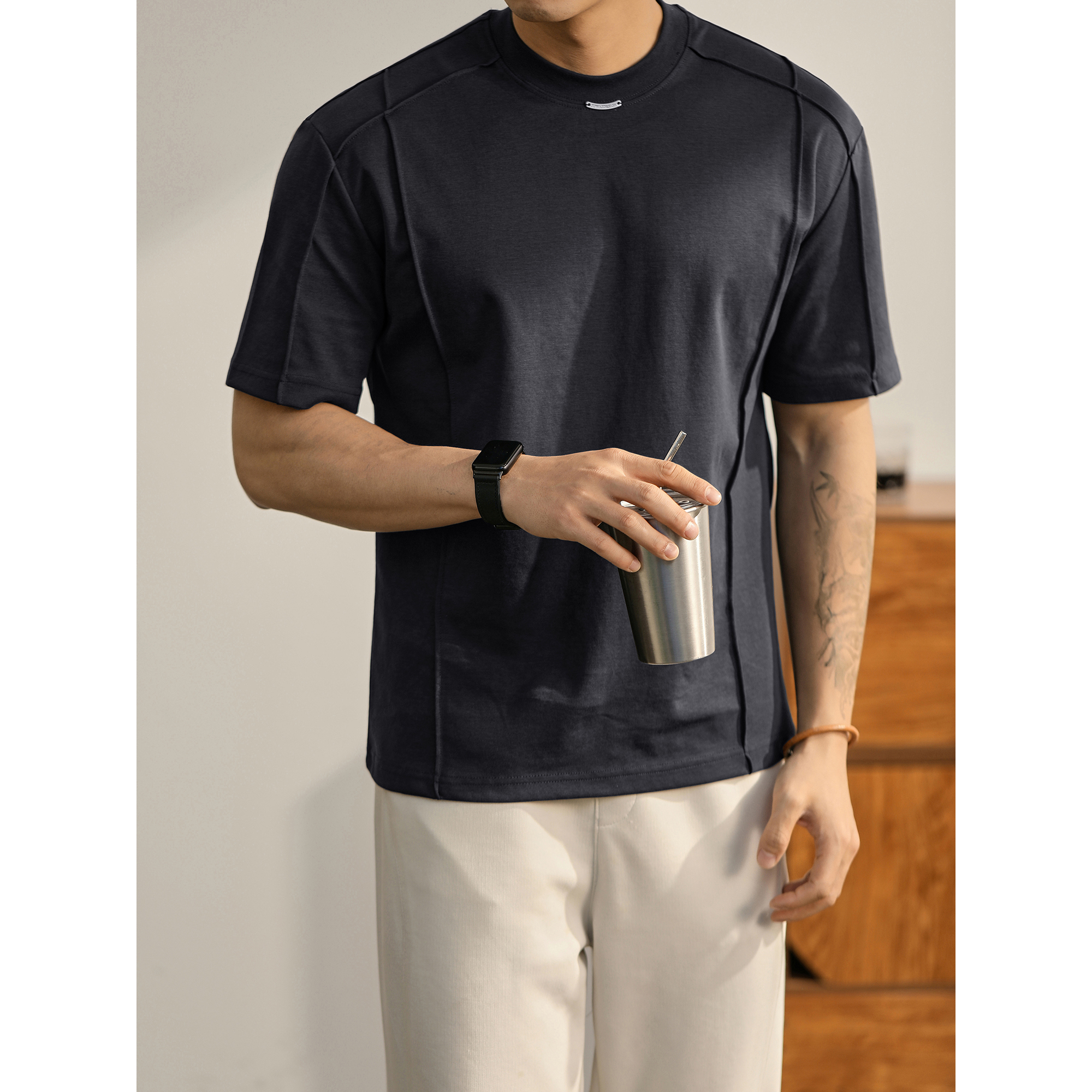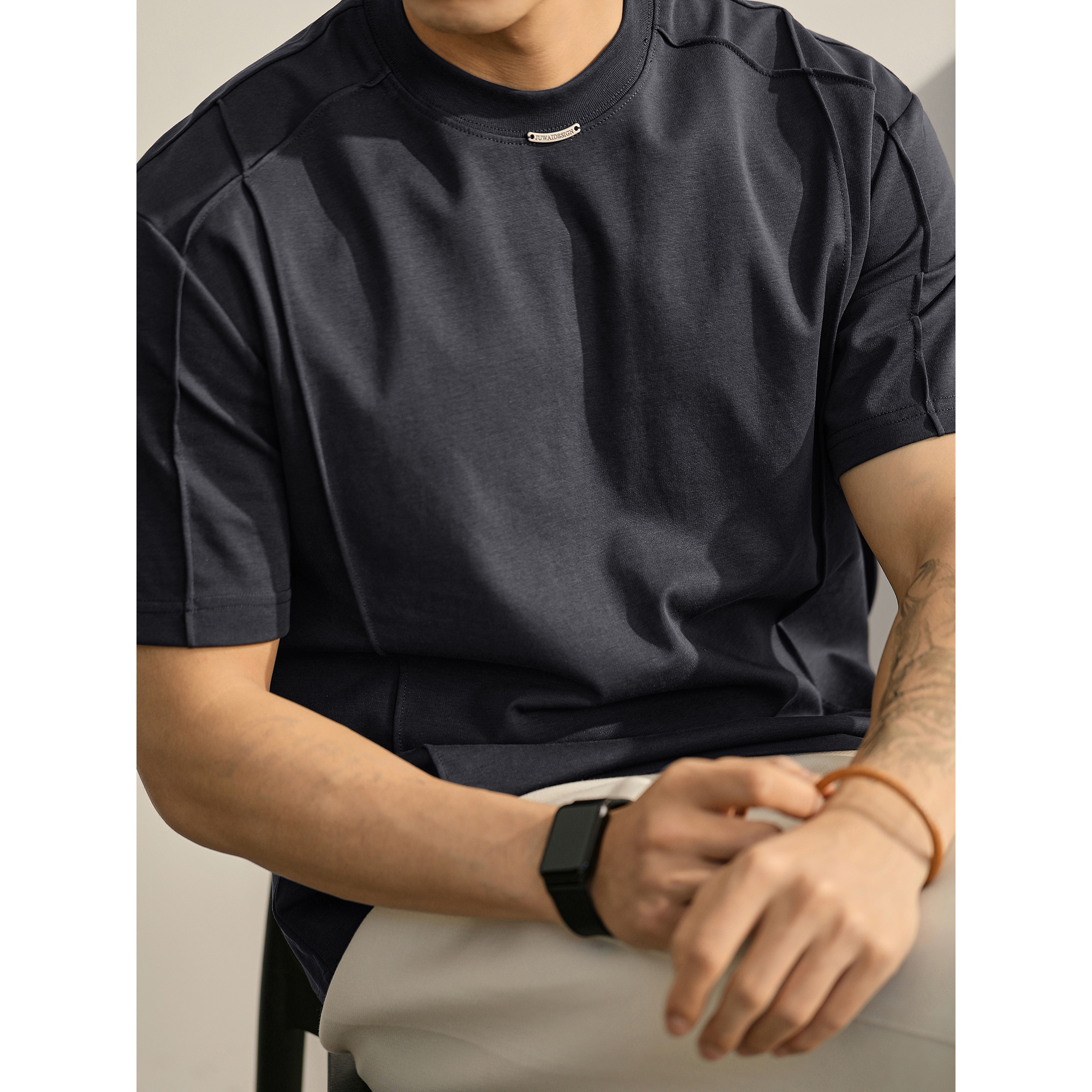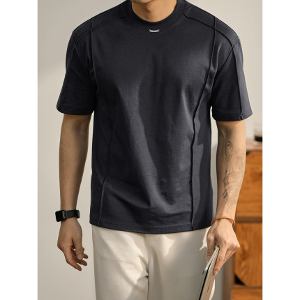 LUUD 男士分割线圆领T恤夏季双面冰爽棉舒适短袖都市休闲百搭上衣