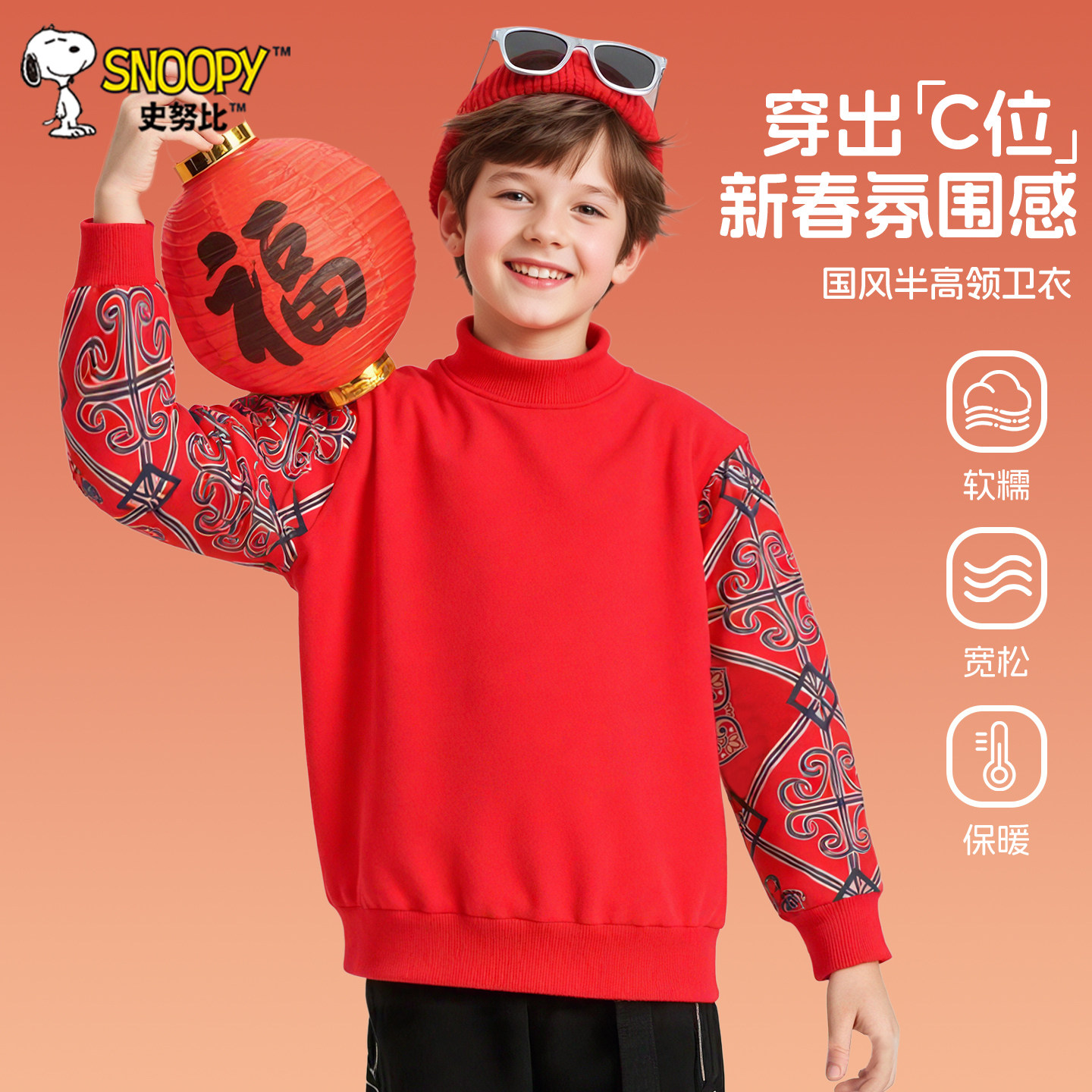 史努比男童加绒卫衣新年国风上衣