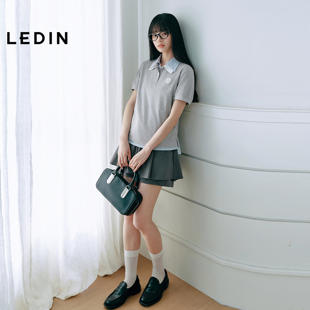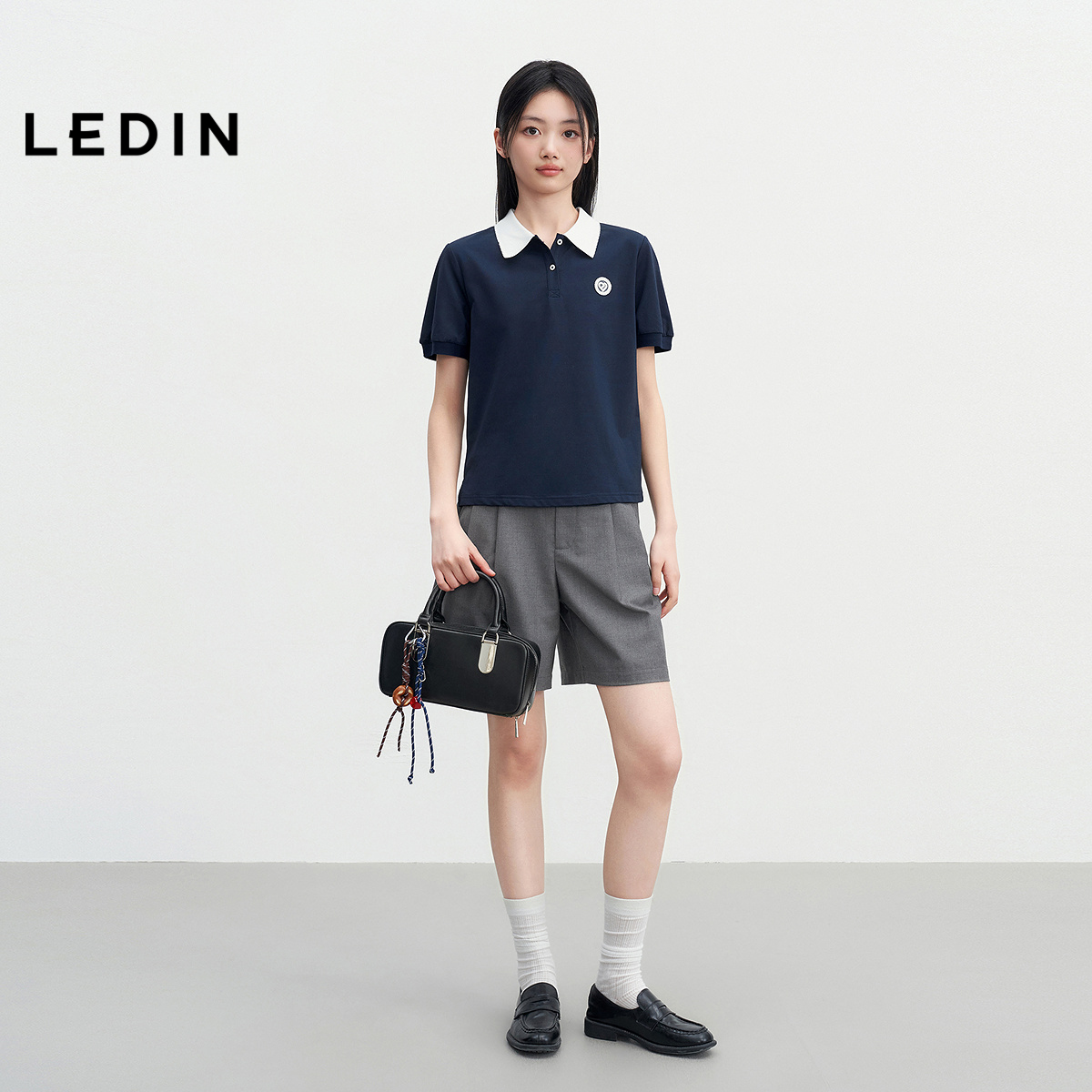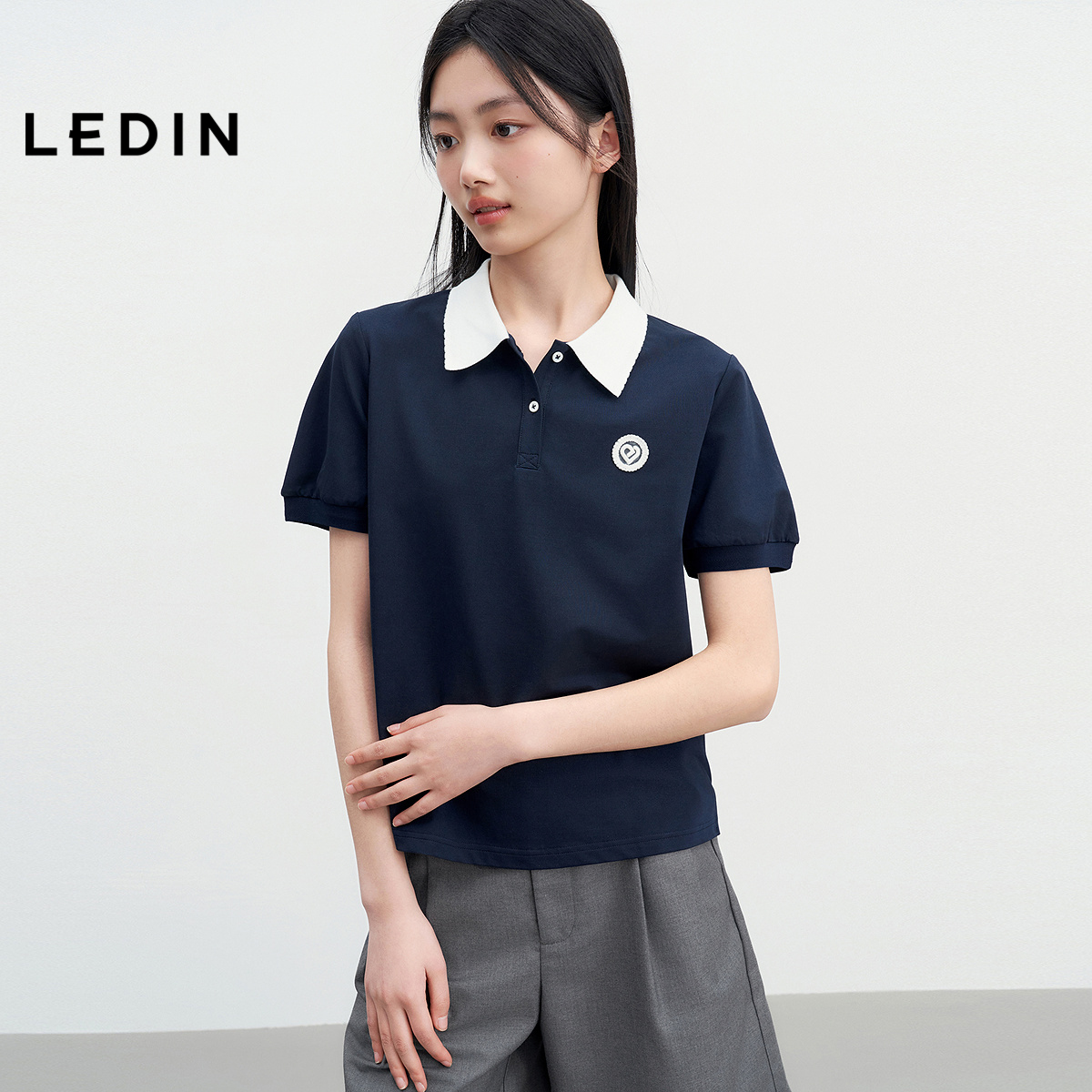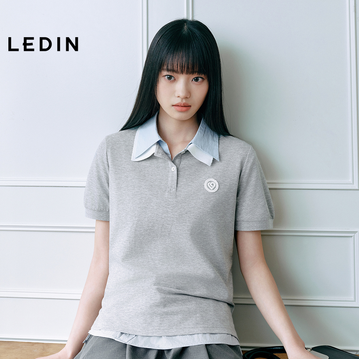 乐町学院风短袖撞色POLO衫25年夏季新款女装爱心袖标泡泡袖上衣