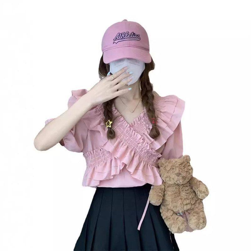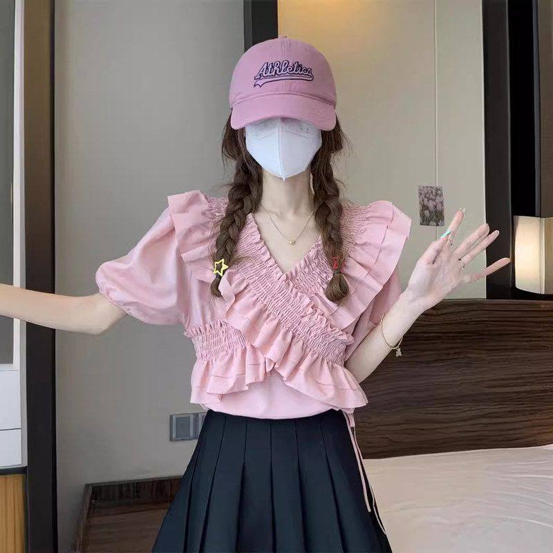 韩版甜美荷叶边交叉短袖V领雪纺衫衬衫女夏季设计感系带短款上衣