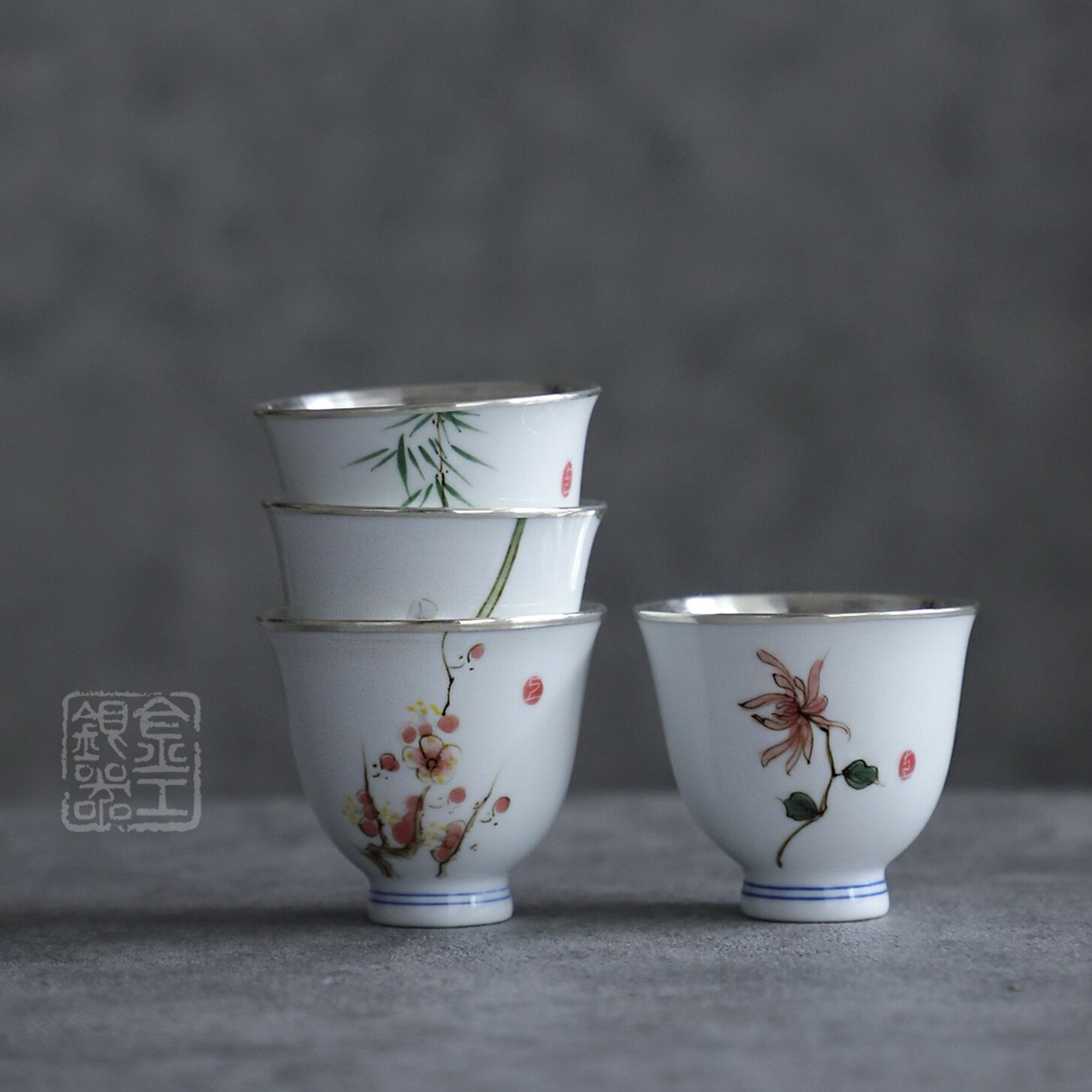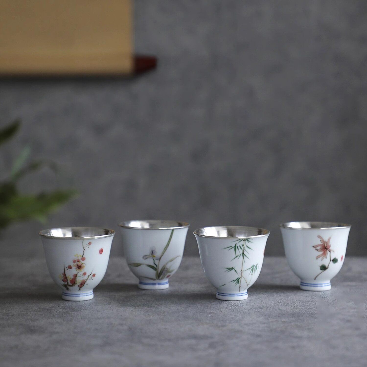 纯银时代 四雅瓷包银杯礼盒景德镇手绘梅兰竹菊品茗杯足银999内胆