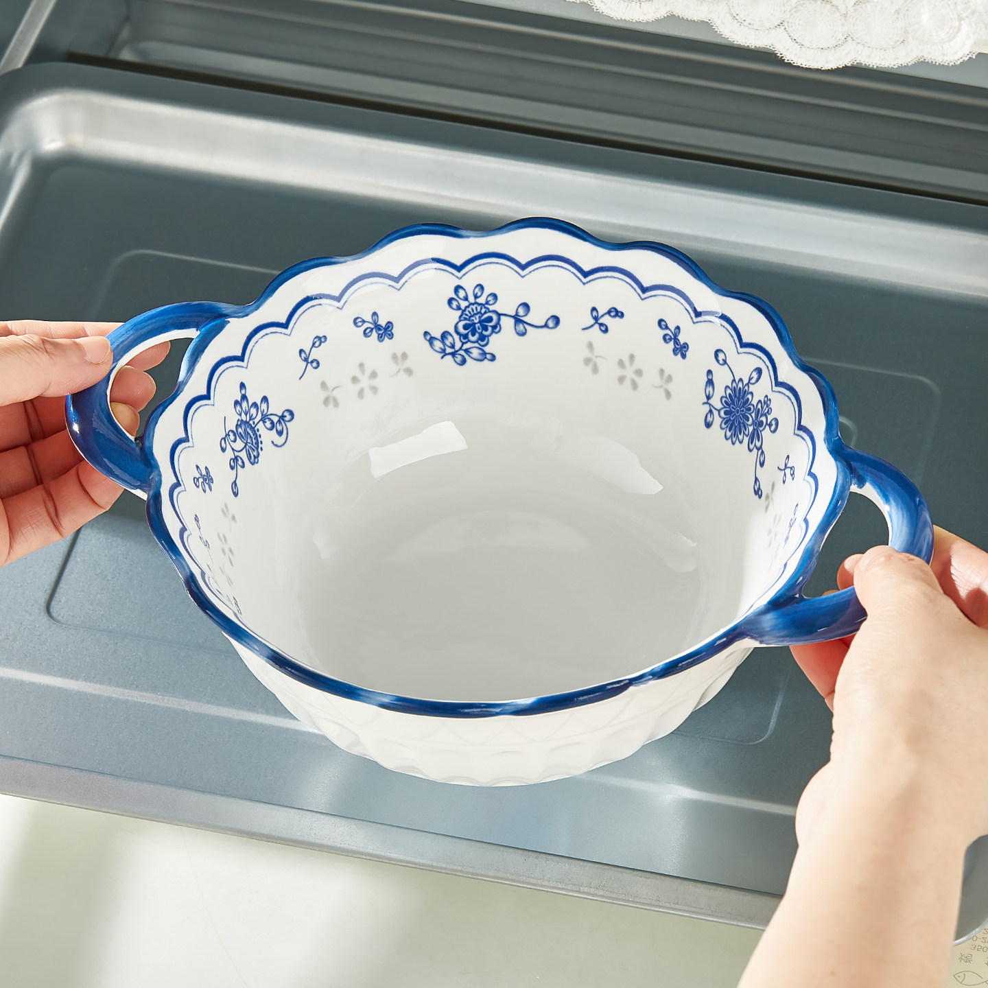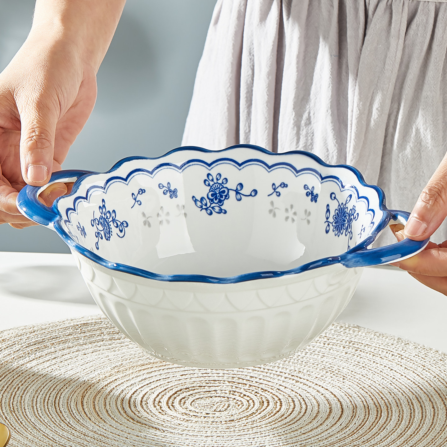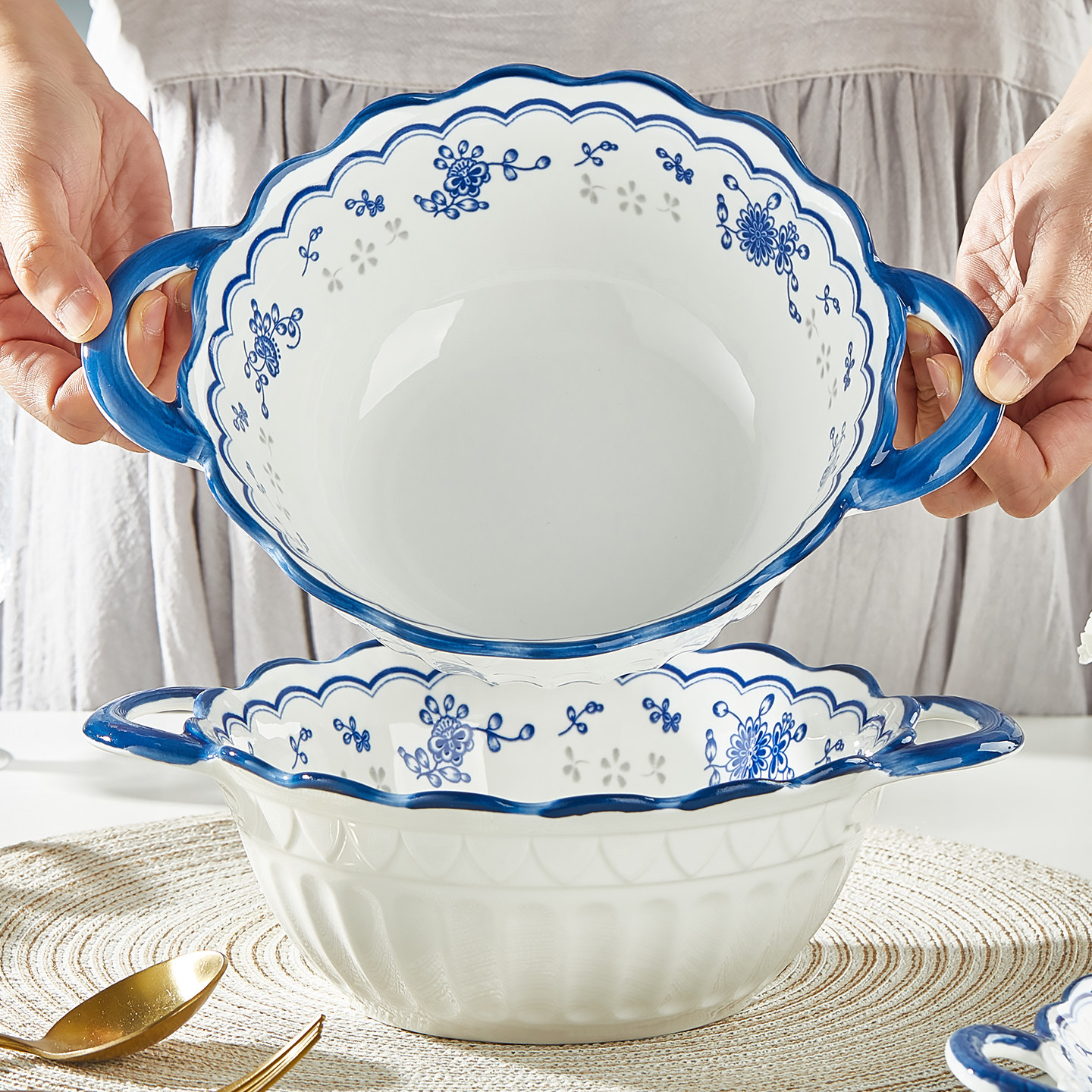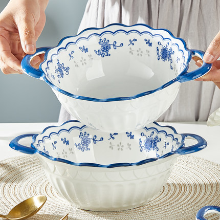 青花双耳汤碗陶瓷大汤碗家用釉下彩餐具加厚防烫面碗汤碗装汤餐具