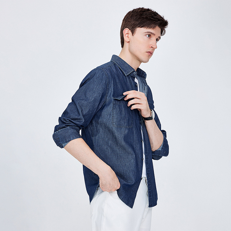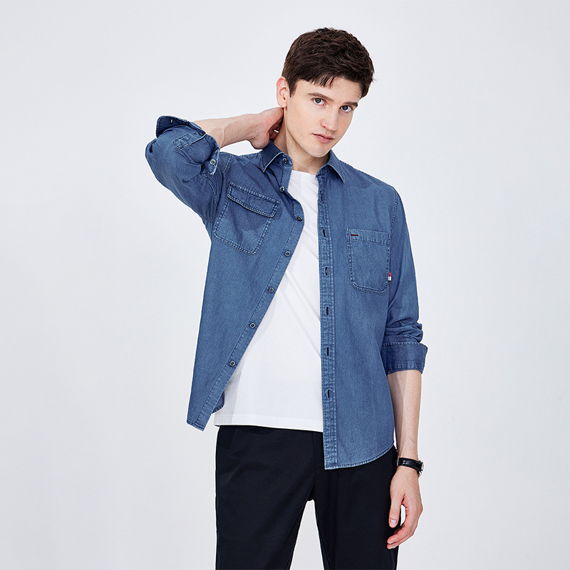 [纯棉]Navigare意大利小帆船蓝色牛仔衬衫男长袖秋季休闲衬衣外套