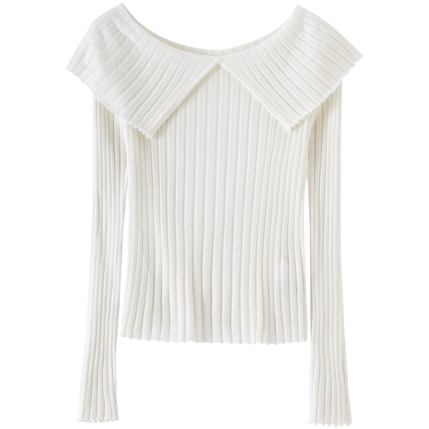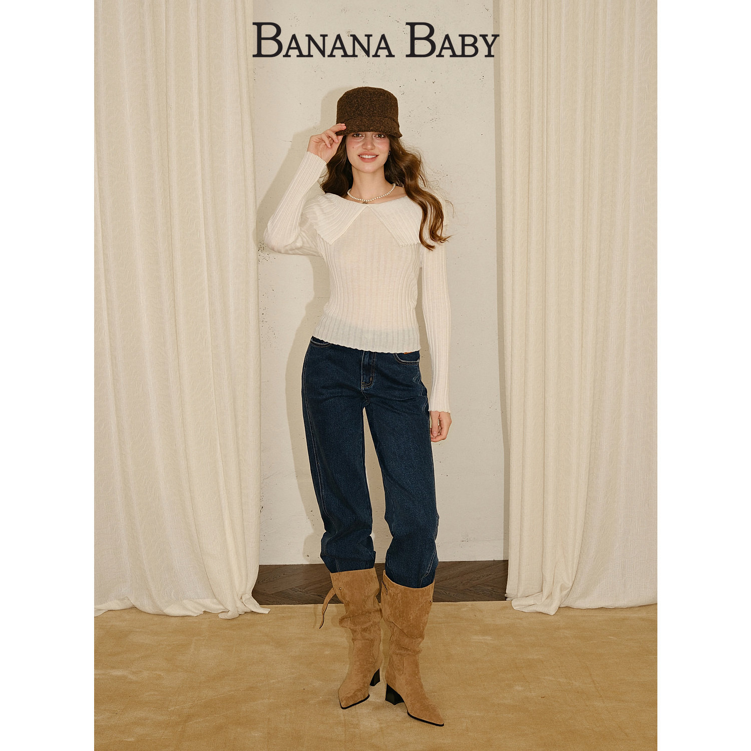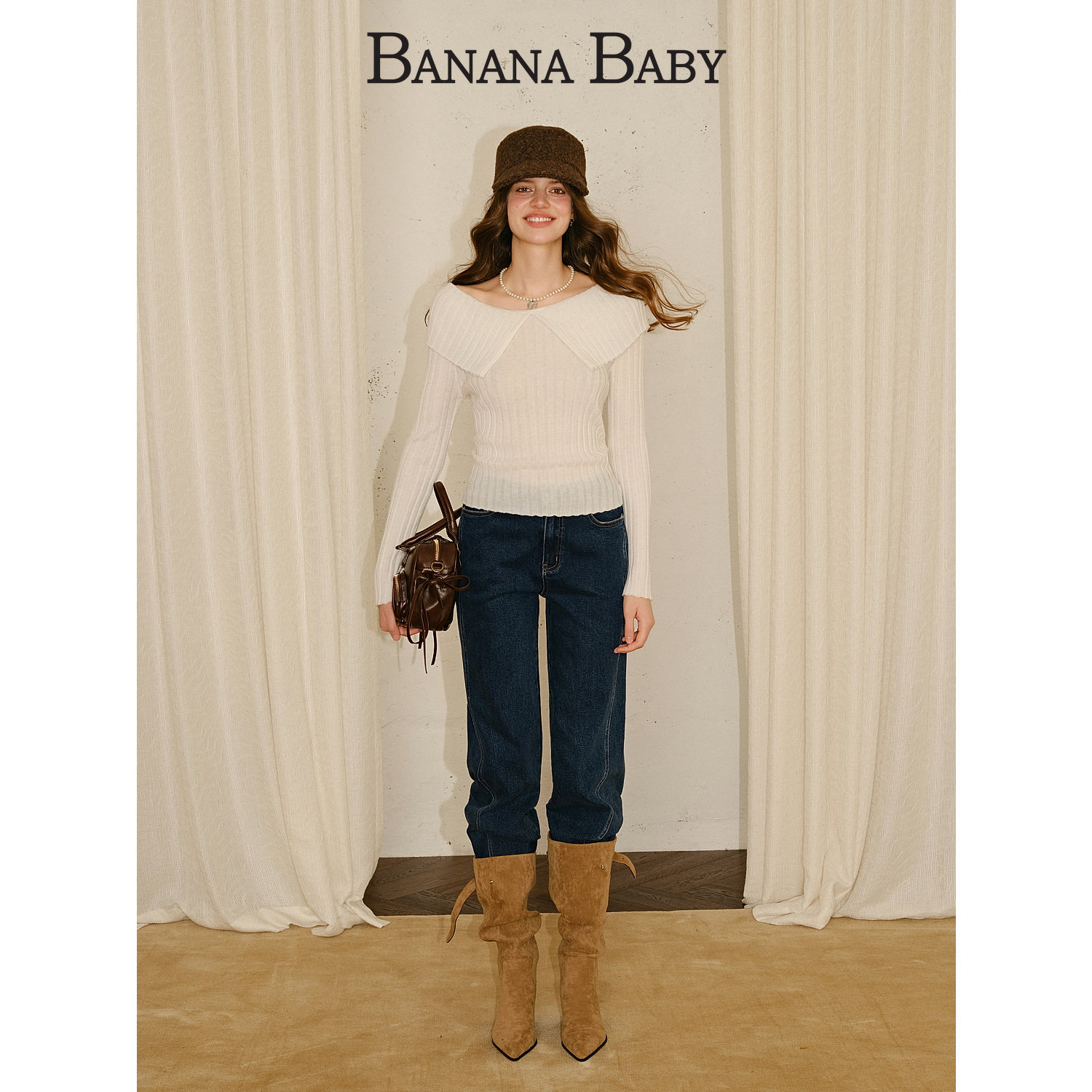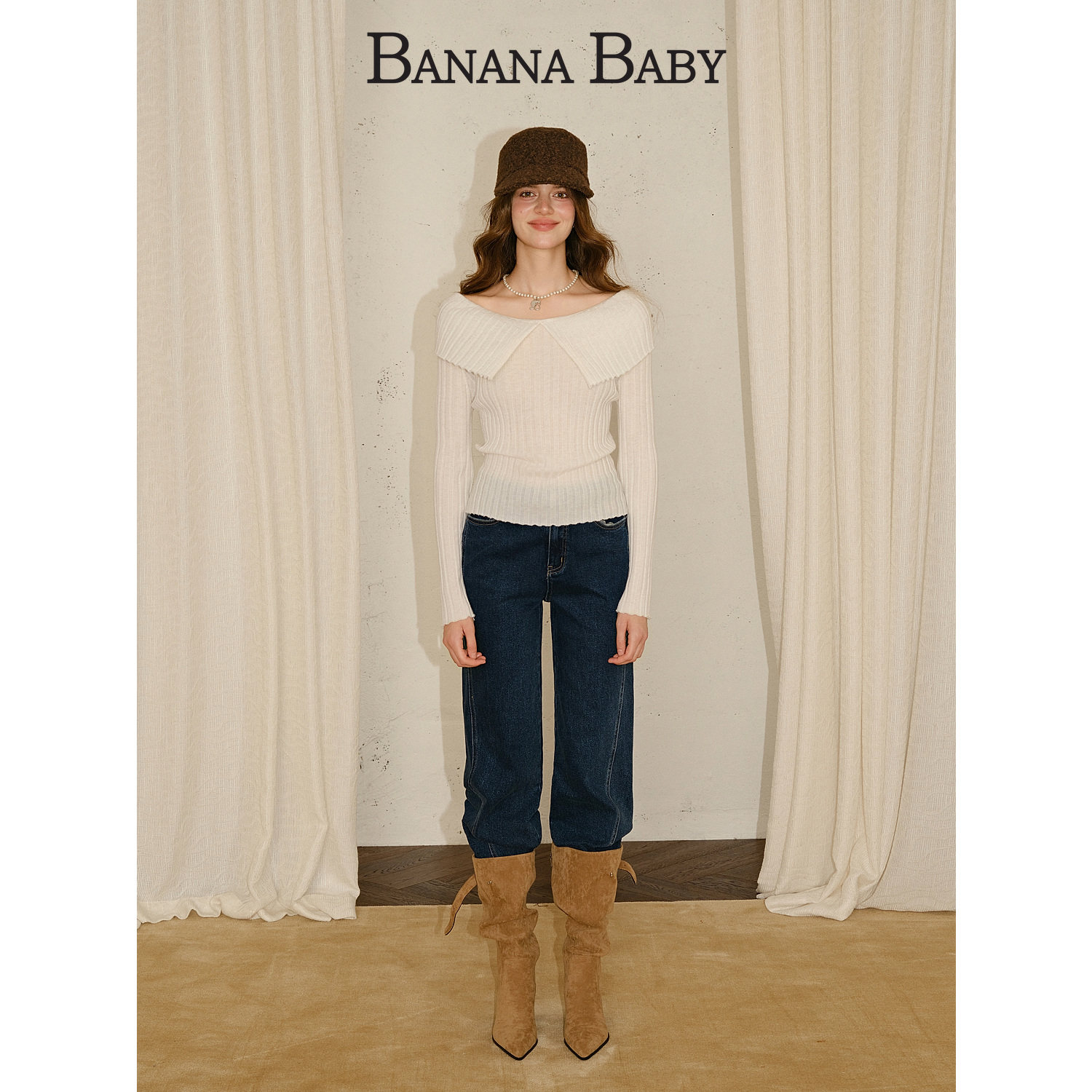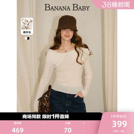 商场同款-BANANA BABY2025年冬新款绵羊毛翻领一字肩修身针织衫女