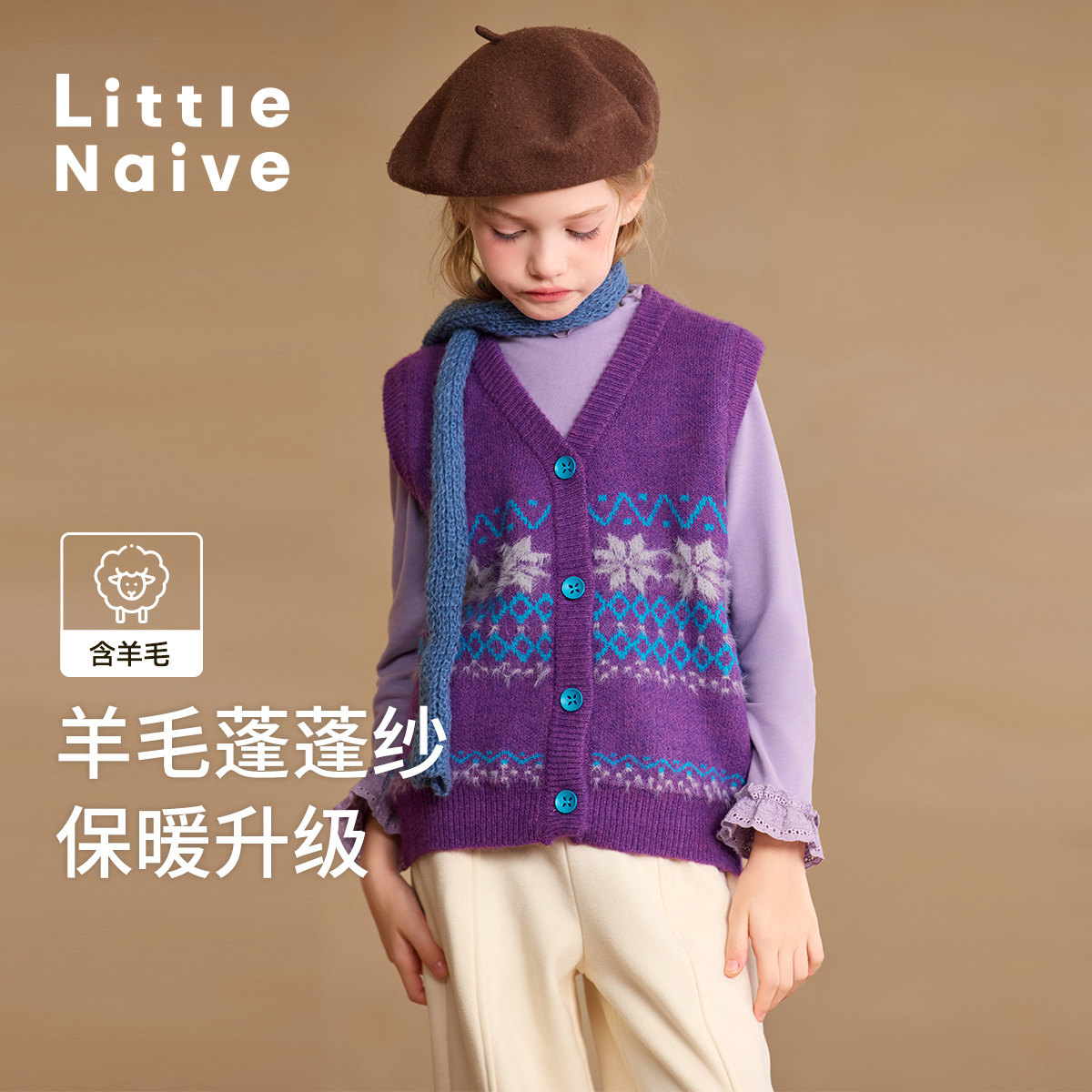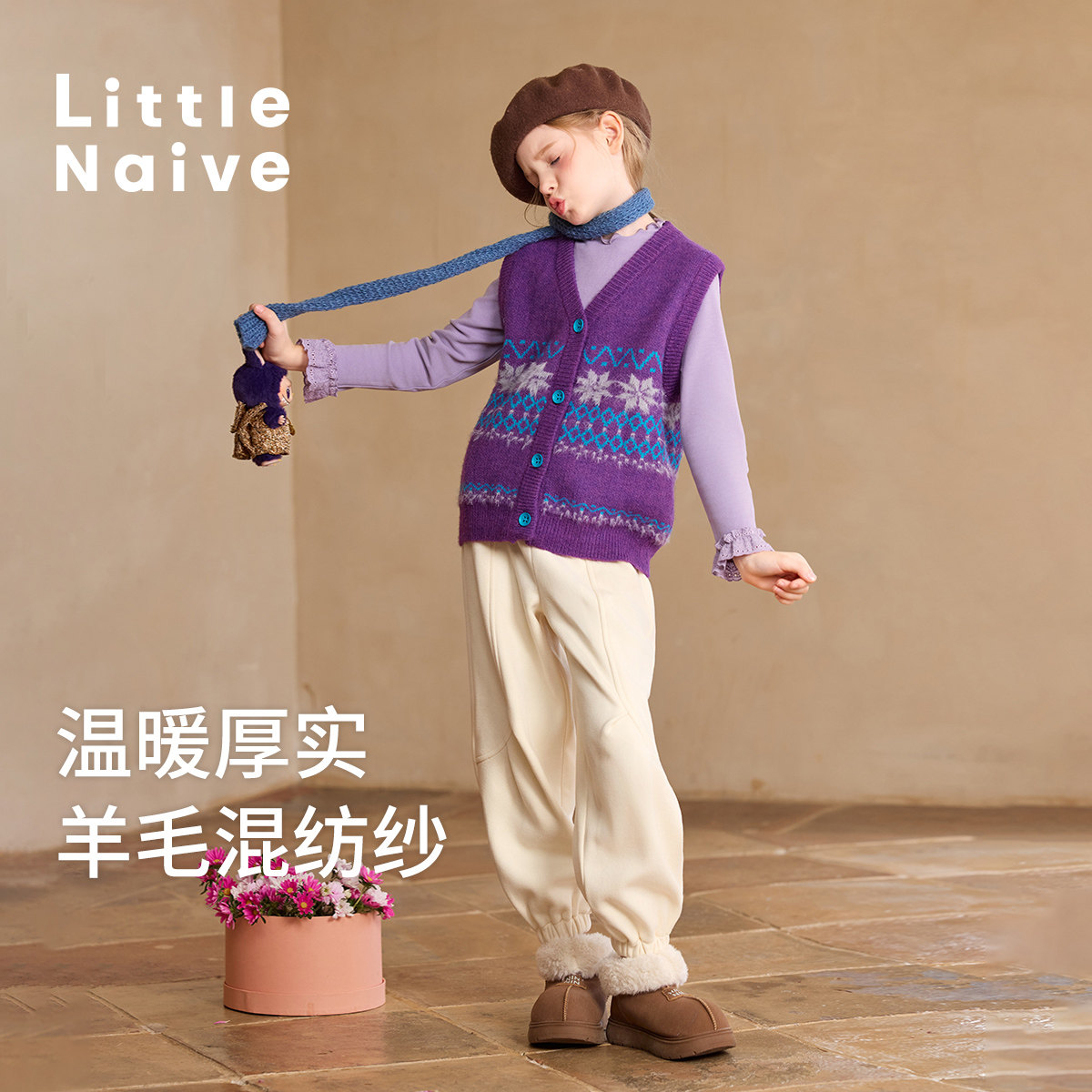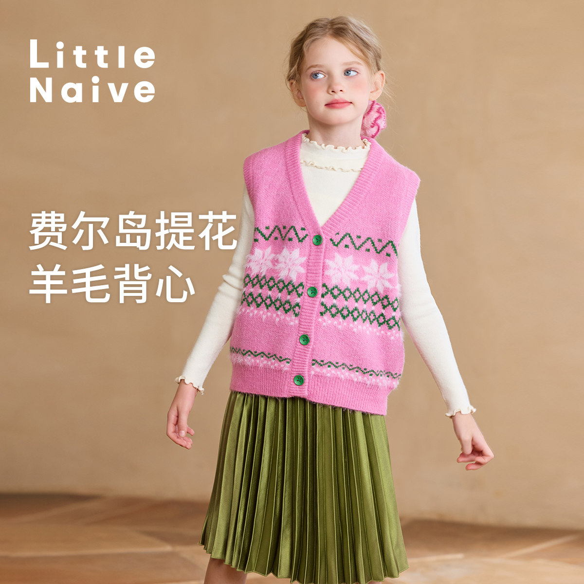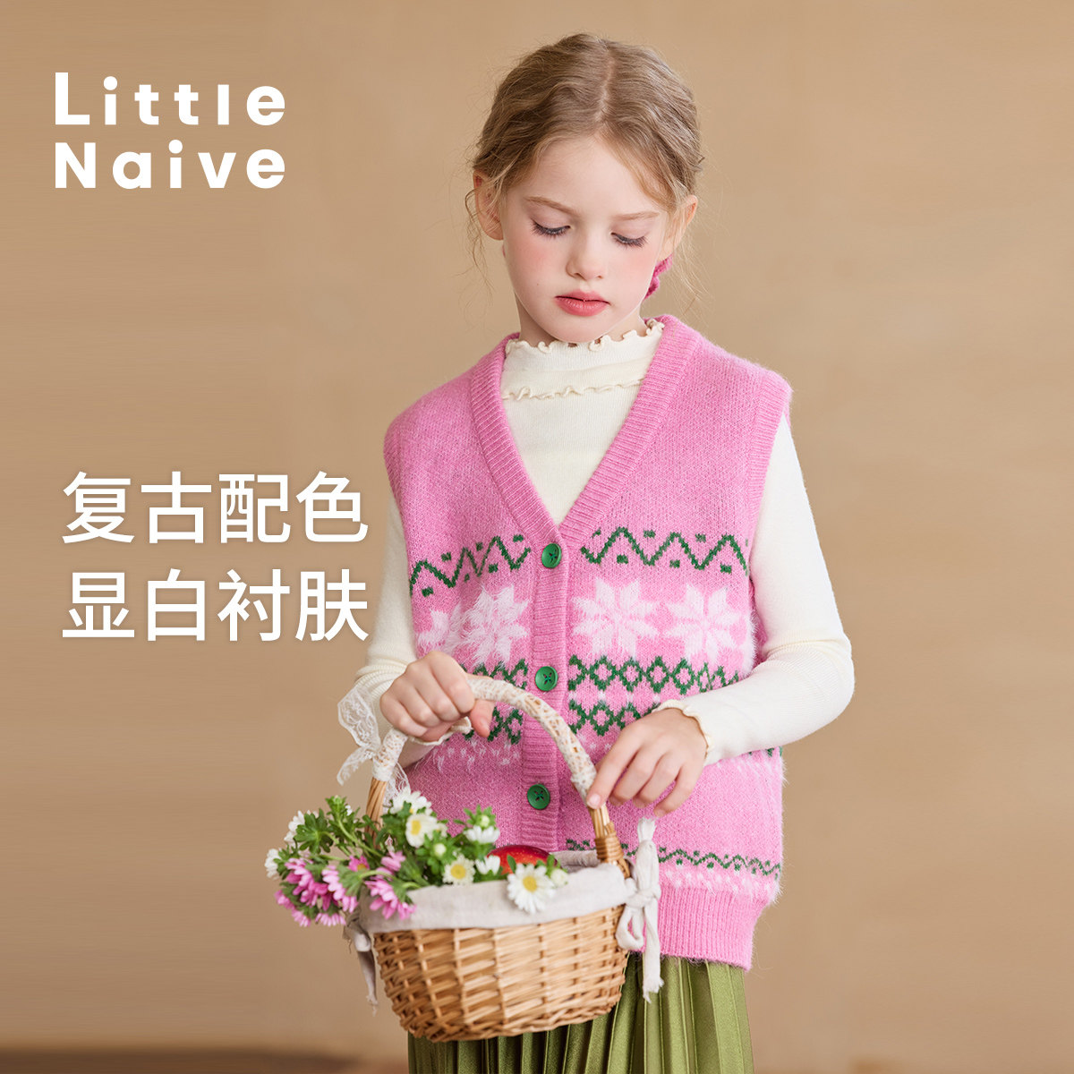 Little Naive女童针织撞色毛衣马甲春秋新款提花背心V领针织衫