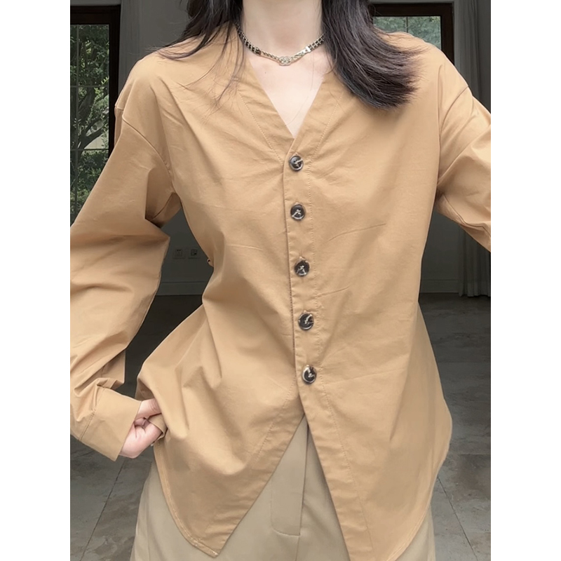 郭九九呢 棉质气质V领绑带收腰显瘦衬衫秋季上衣女简约百搭短裤