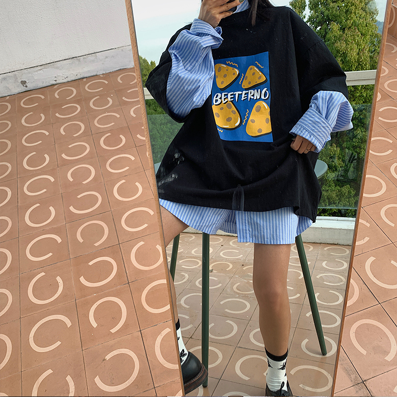 怪味少女短袖T恤女夏韩版港风卡通印花半袖体恤ins学生宽松上衣服
