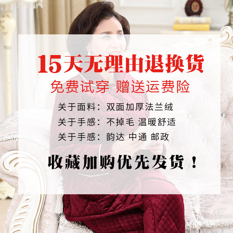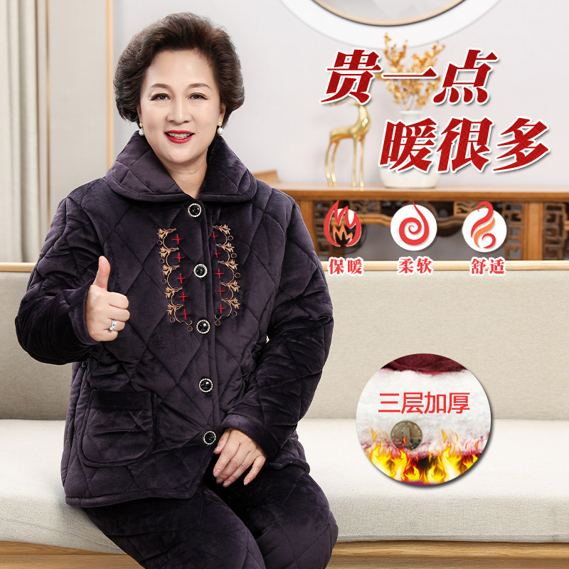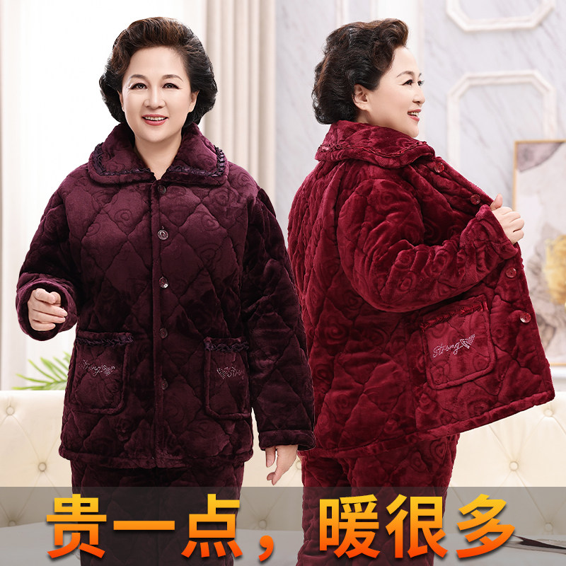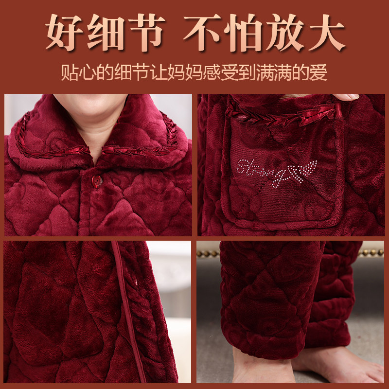 冬天中老年睡衣女法兰绒夹棉加厚款老人套装棉袄珊瑚绒妈妈家居服