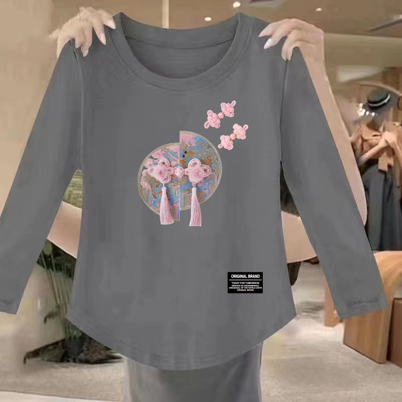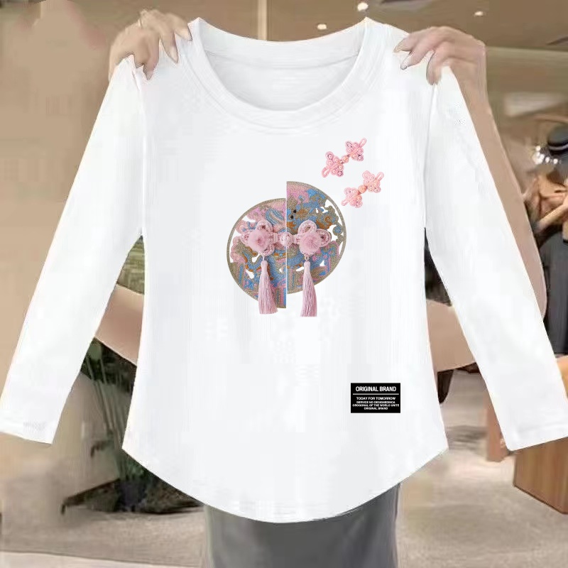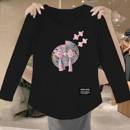 清仓捡漏老年新中式圆领长袖T恤女国风印花上衣弧形设计感打底衫