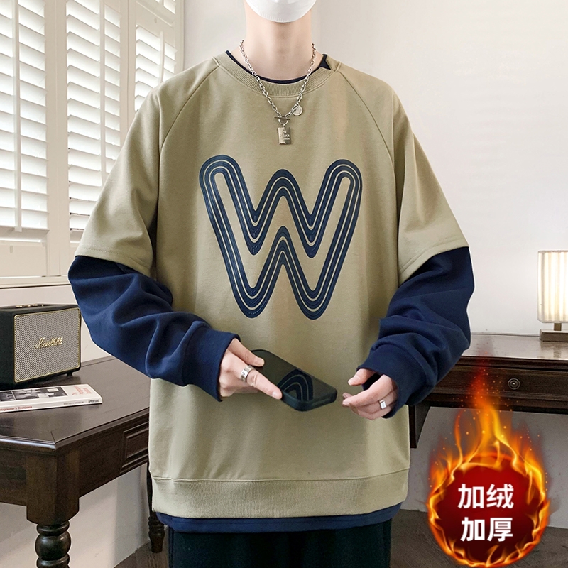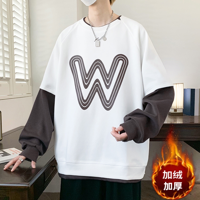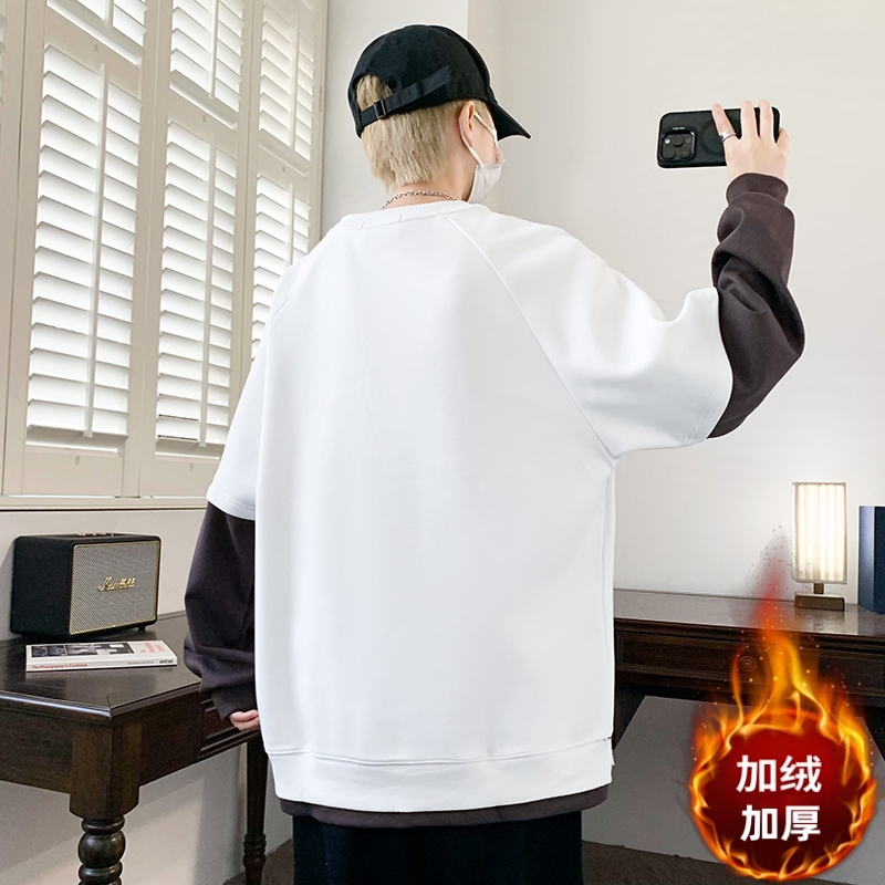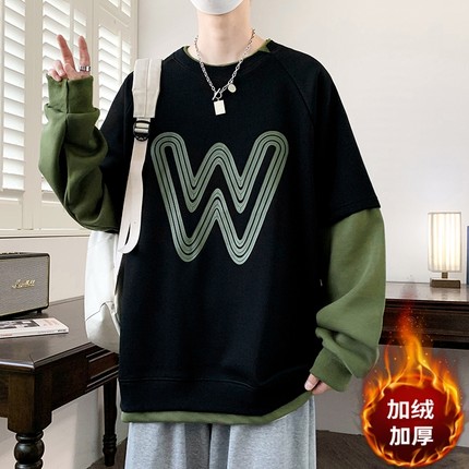 秋冬季青少年酷帅加绒卫衣男孩初高中学生长袖t恤大童假两件上衣