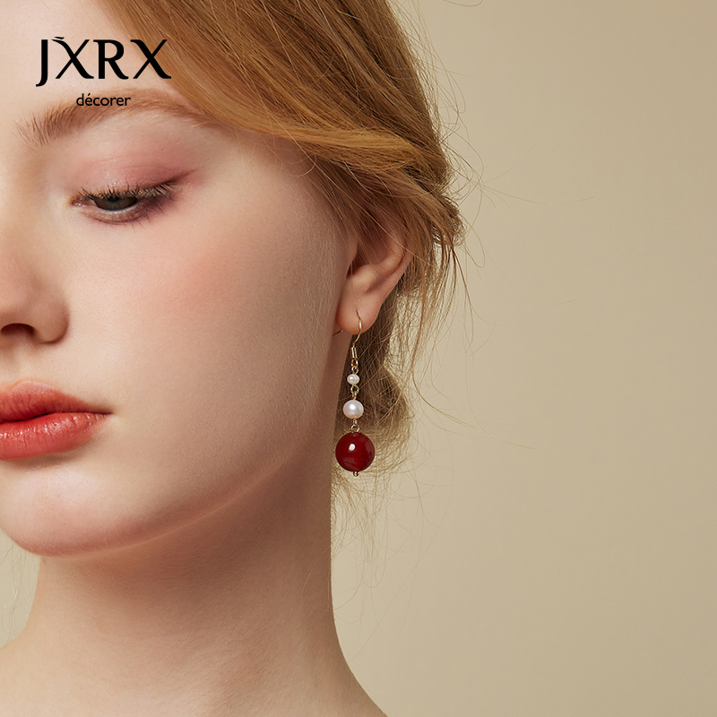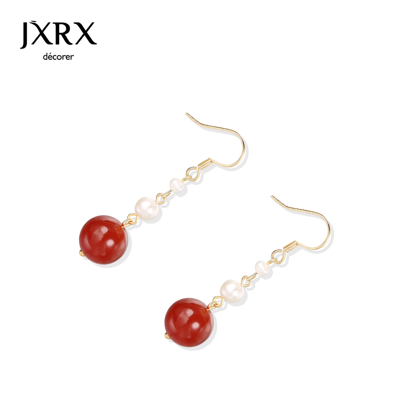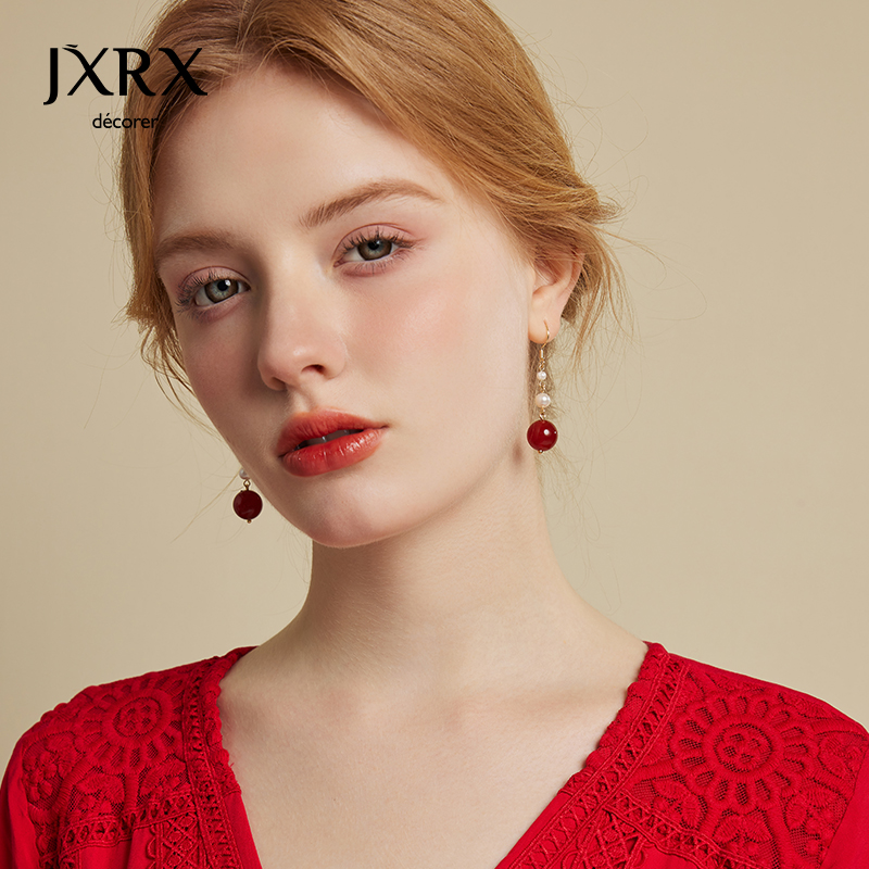 JXRX红色玛瑙耳环女天然淡水珍珠耳钉新款2025爆款过年喜庆耳饰