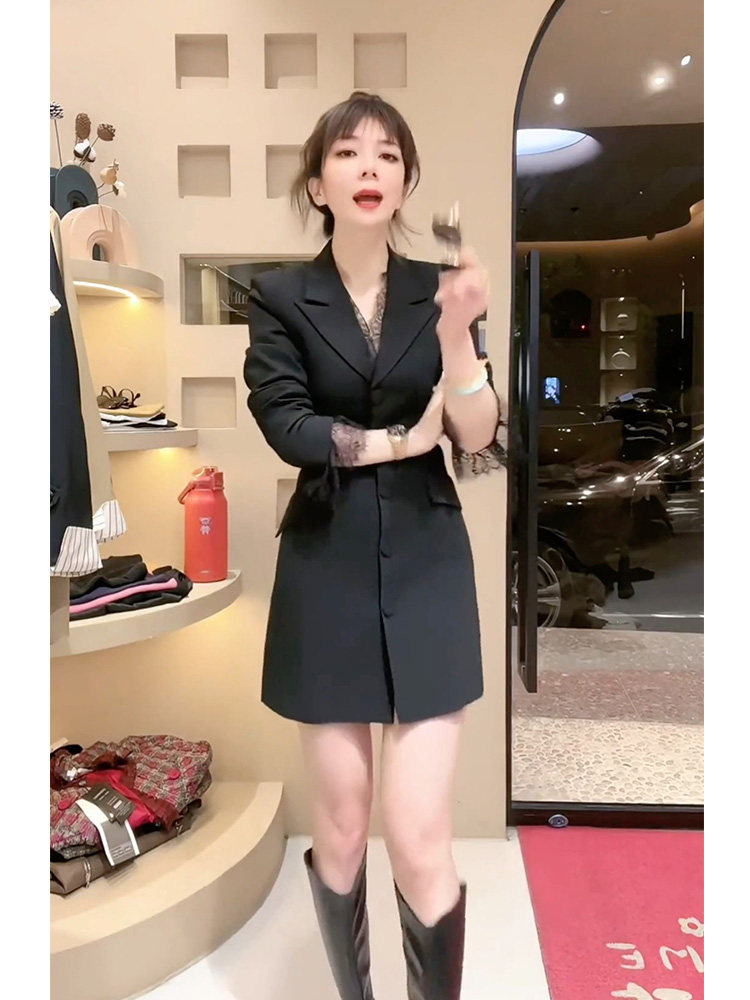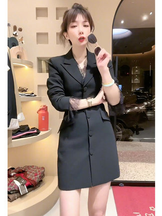 气质显瘦黑色蕾丝长袖连衣裙女秋冬轻熟风西装小个子高级感小黑裙