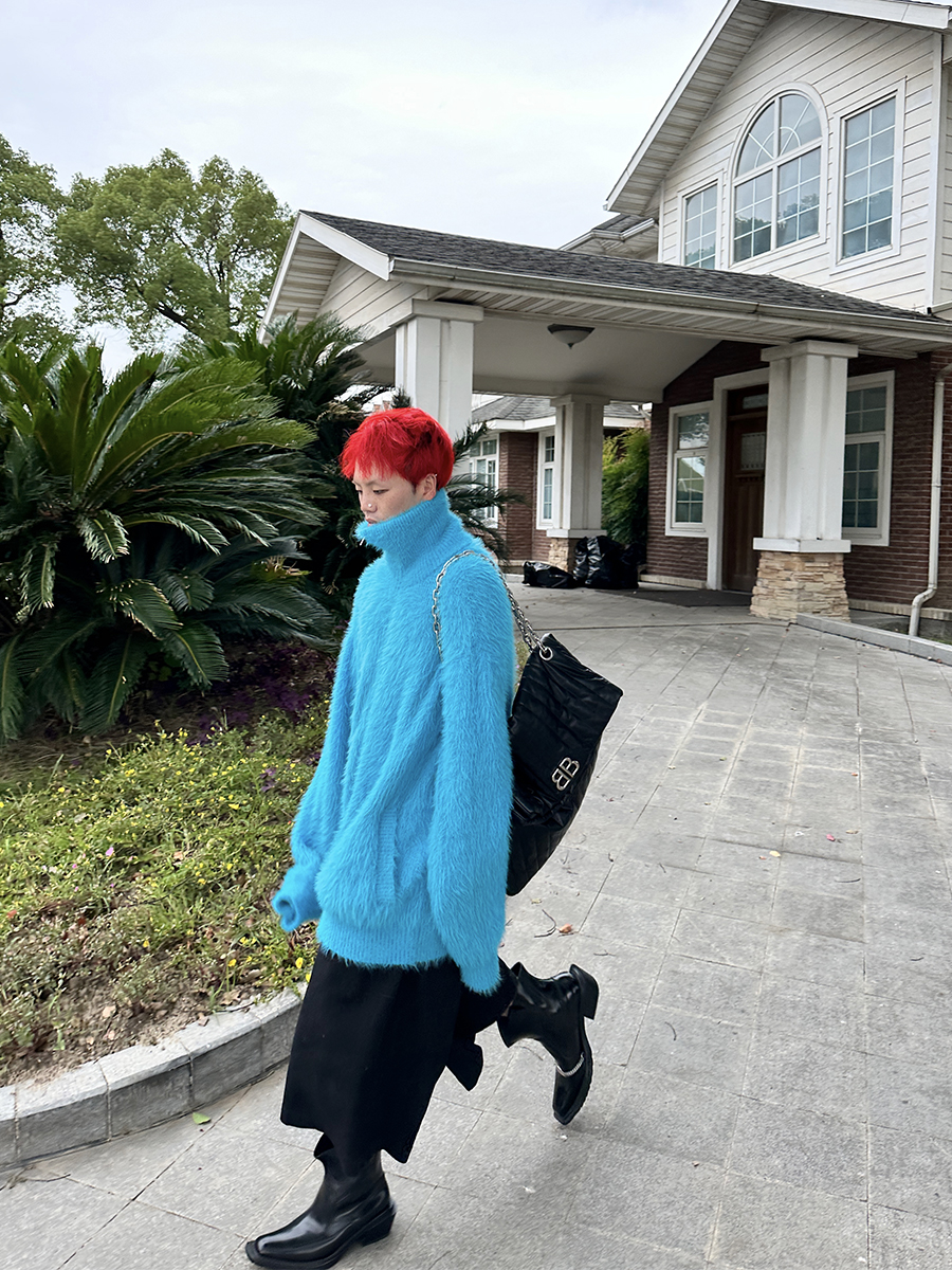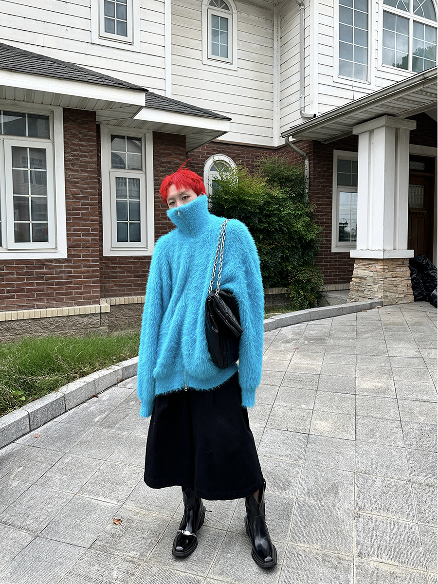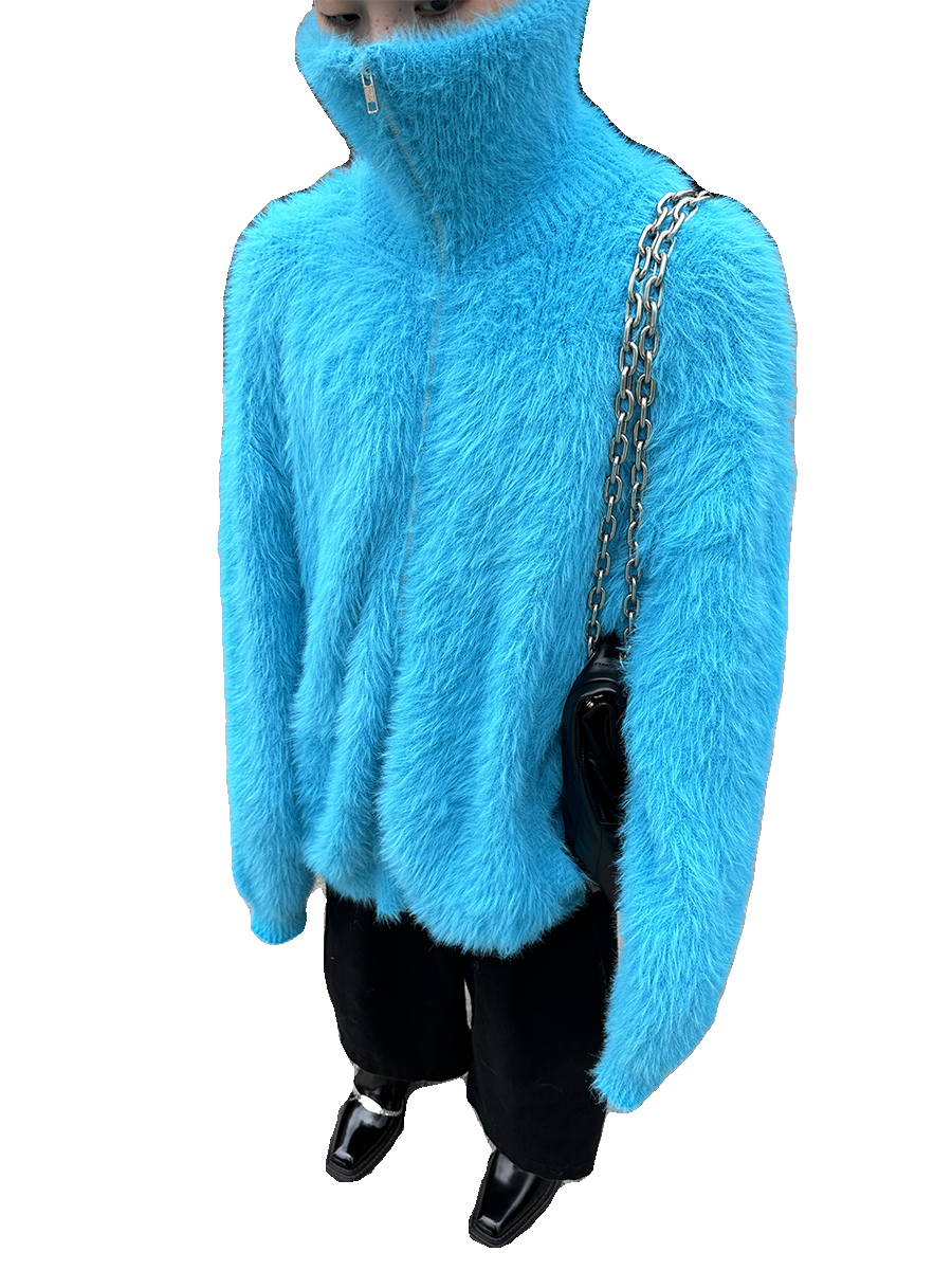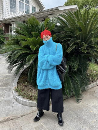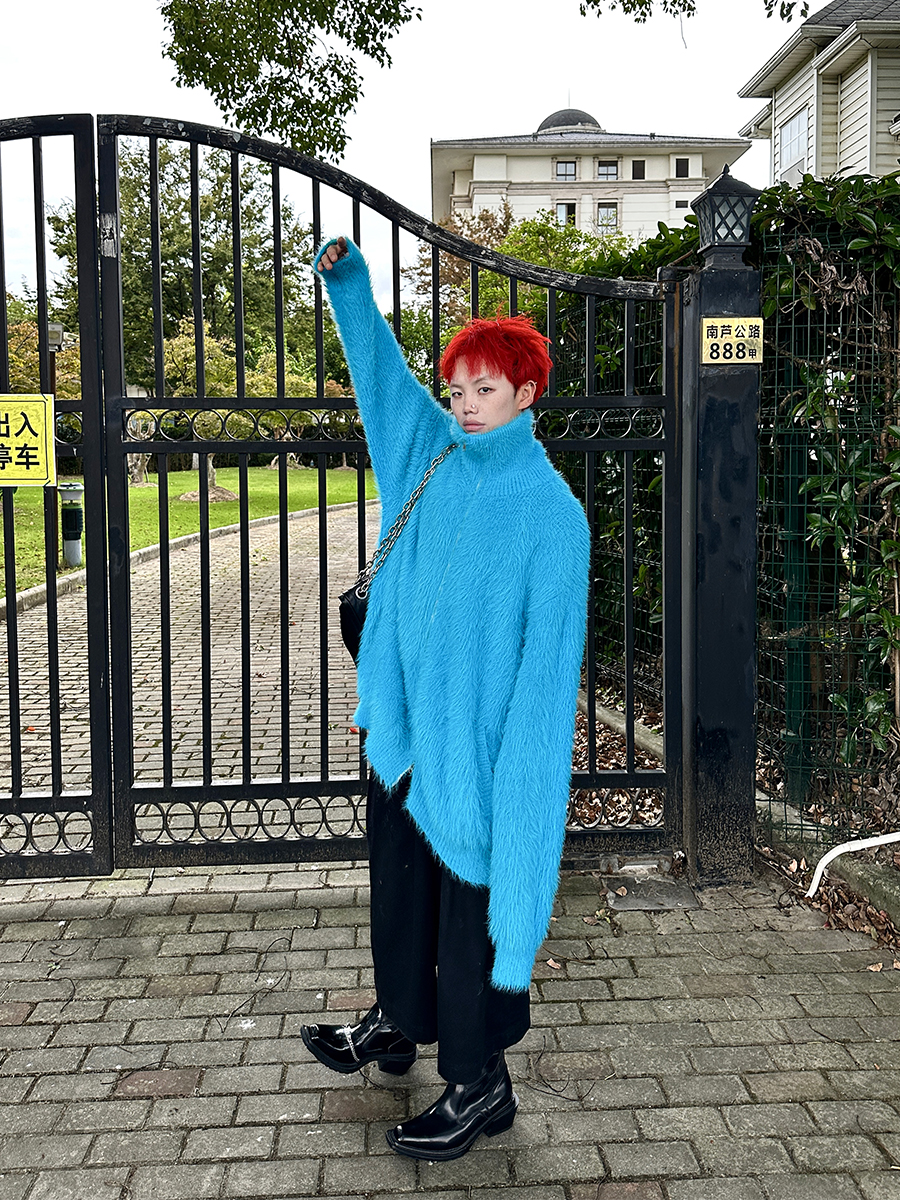 [GINGER MI]FEAR4FREE无性别翻领双拉链仿貂绒宽松高领毛衣外套男