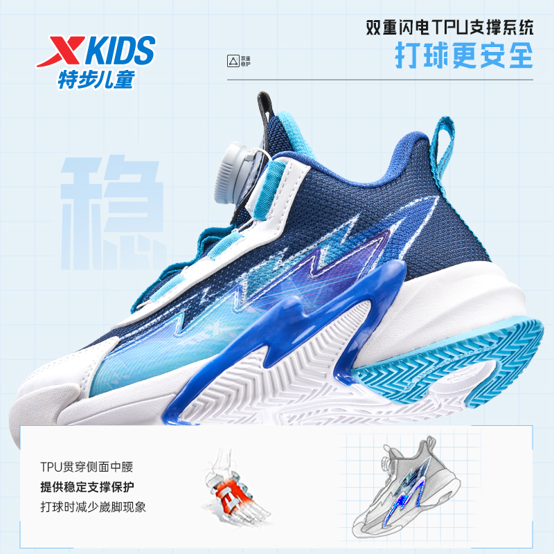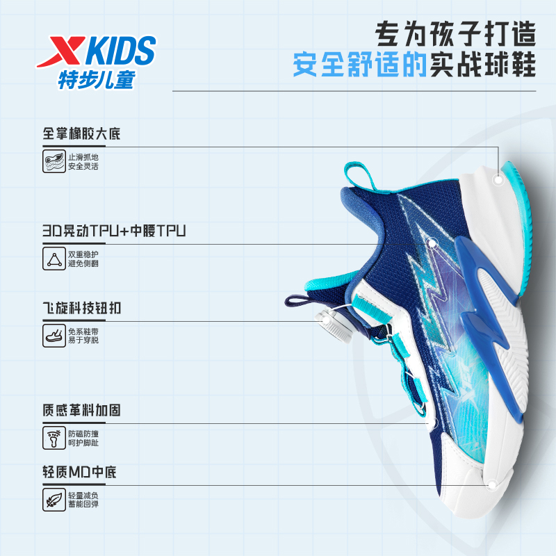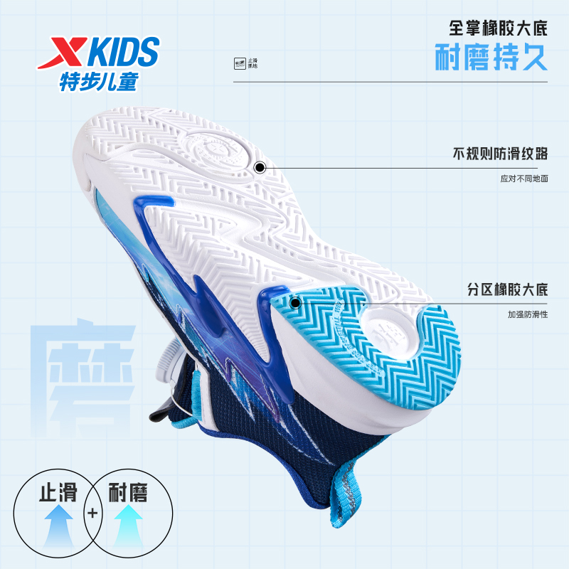 特步童鞋儿童革面拼接旋钮扣运动鞋男童3D晃动气泡防滑减震篮球鞋