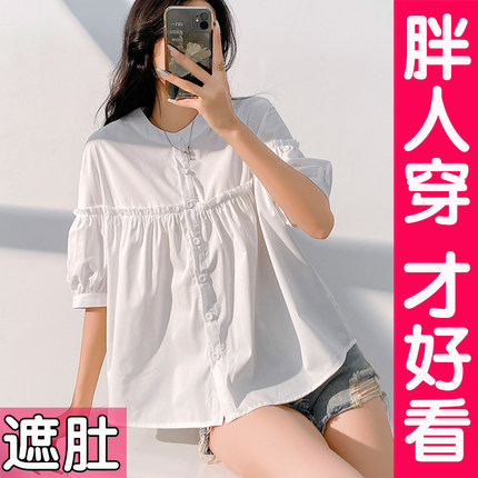 加肥加大码宽松遮肚子白色衬衫女微胖衬衣高级感上衣小衫胖mm夏季