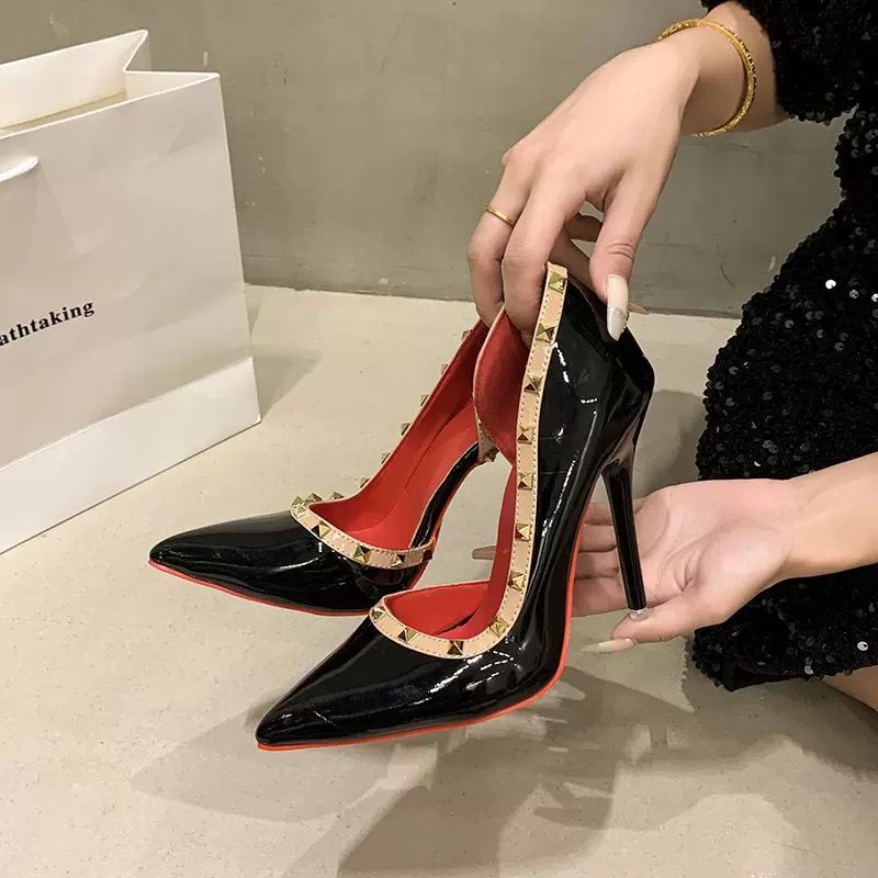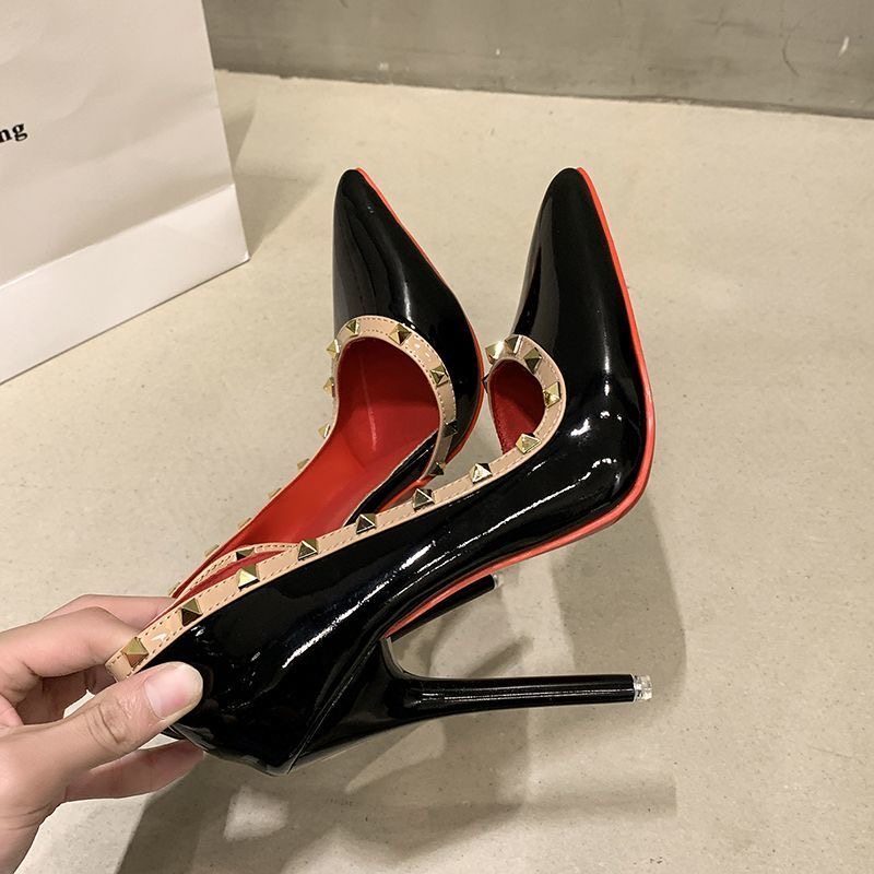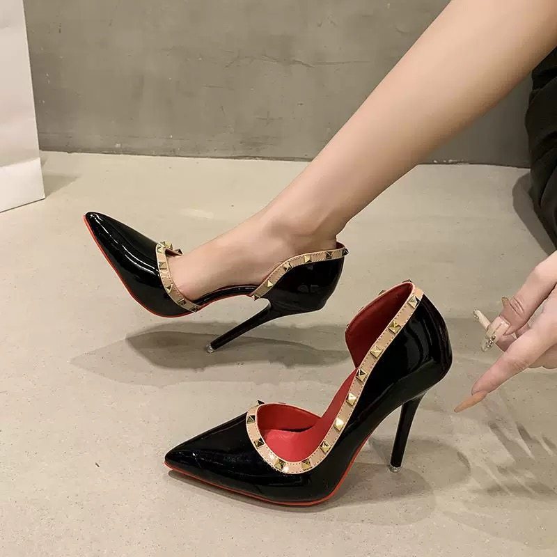35-46大码 12cm高跟鞋女2025新款侧空尖头铆钉性感细跟浅口单鞋45