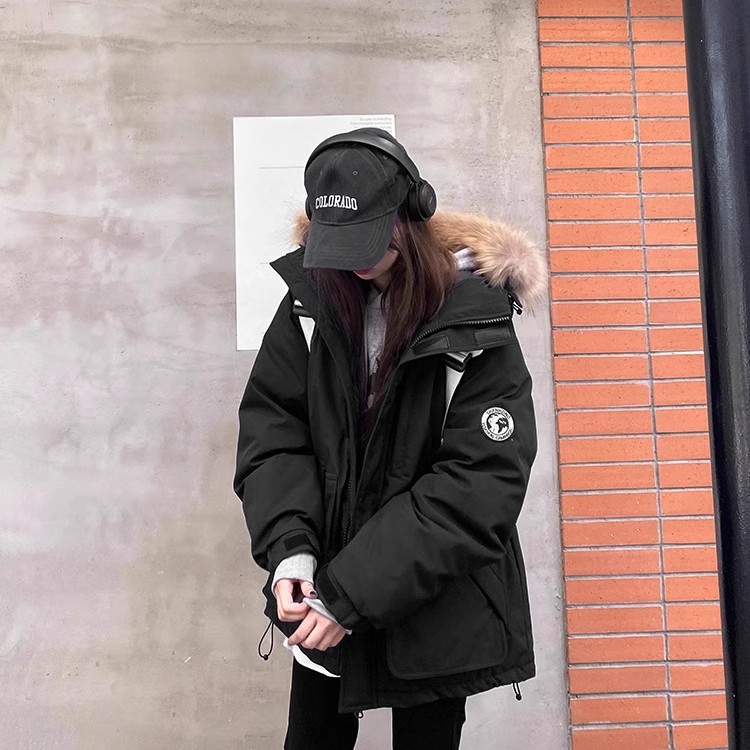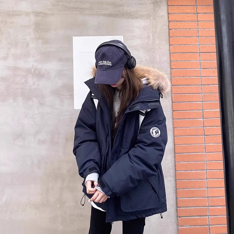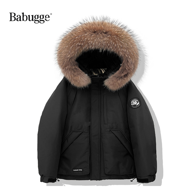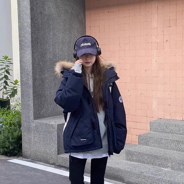 Babugge 藏青色工装派克棉服男女冬季情侣款加厚短款毛领棉袄外套