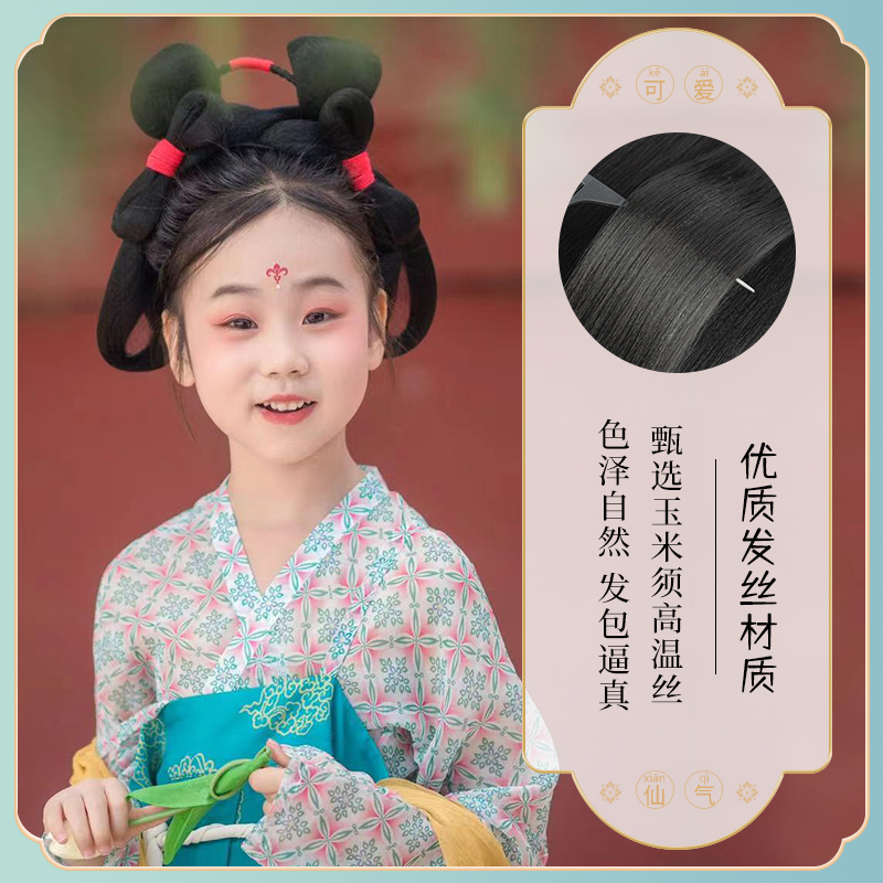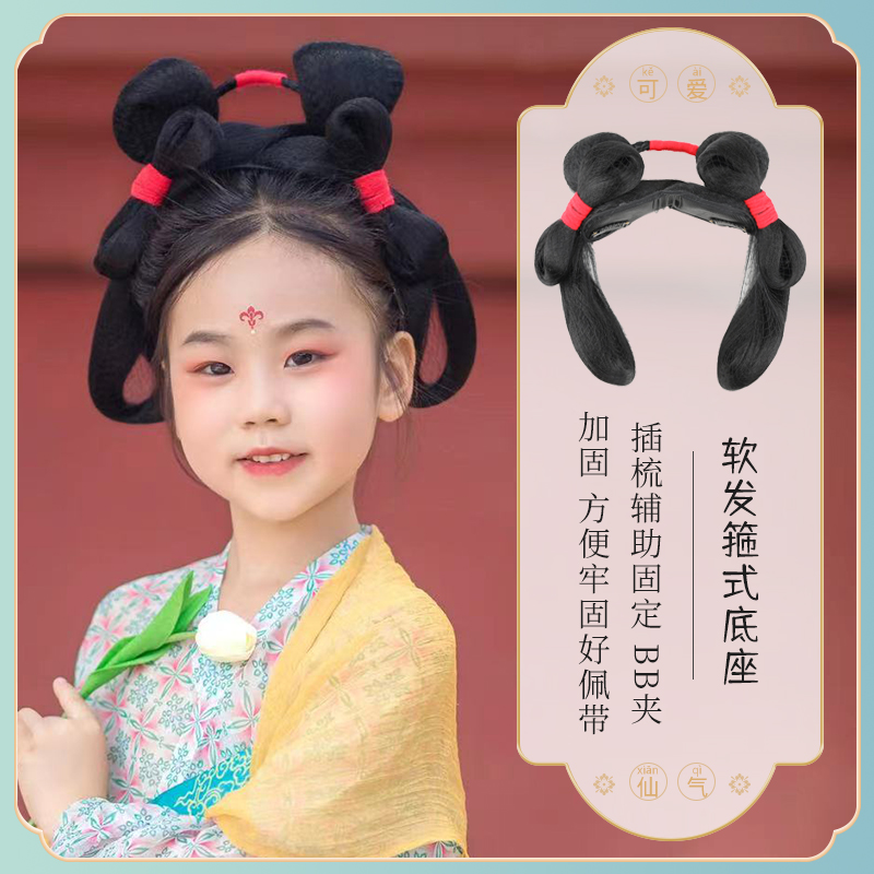 儿童一体式发髻古风古装假发唐风汉服襦裙造型发包蝴蝶结兔耳发箍