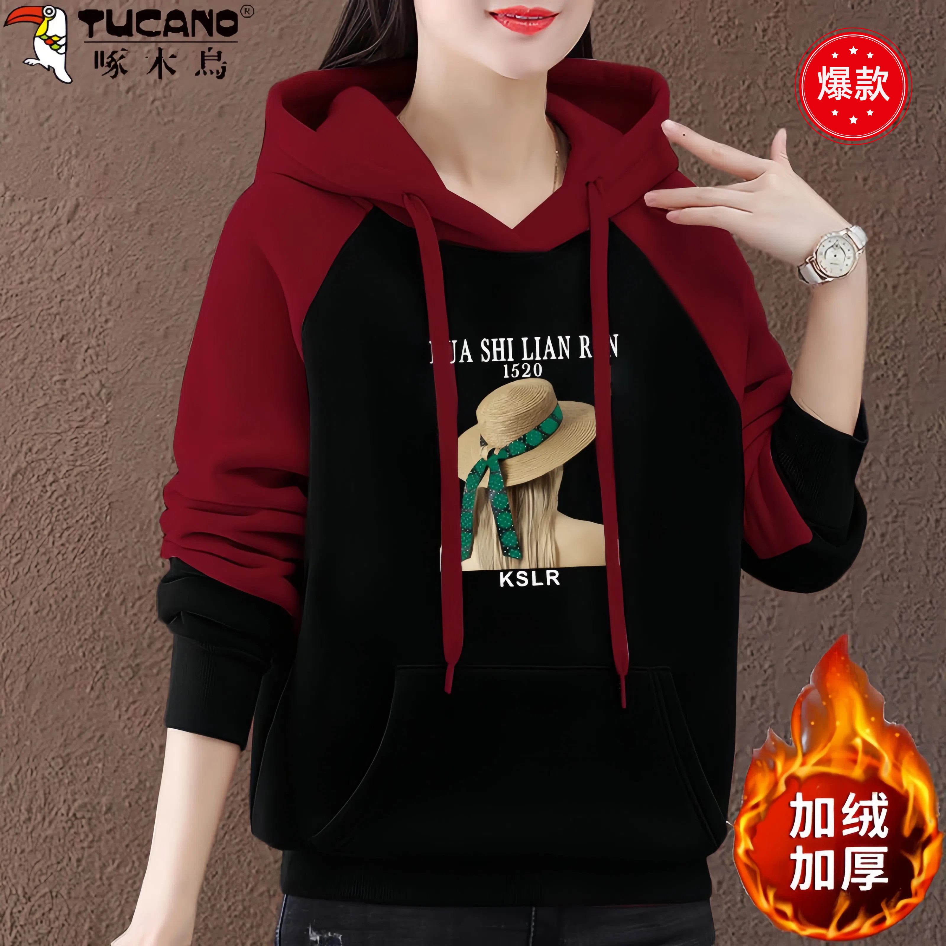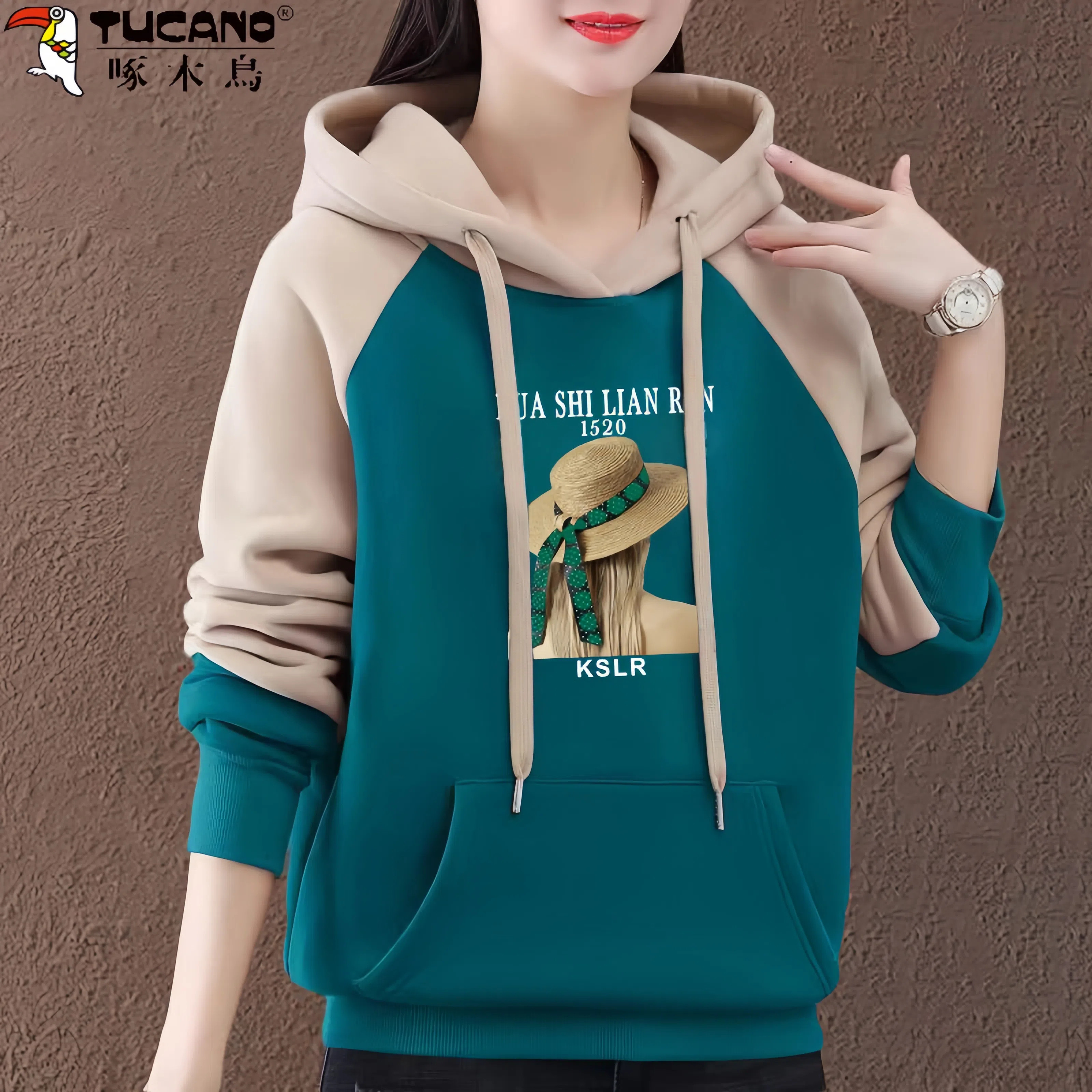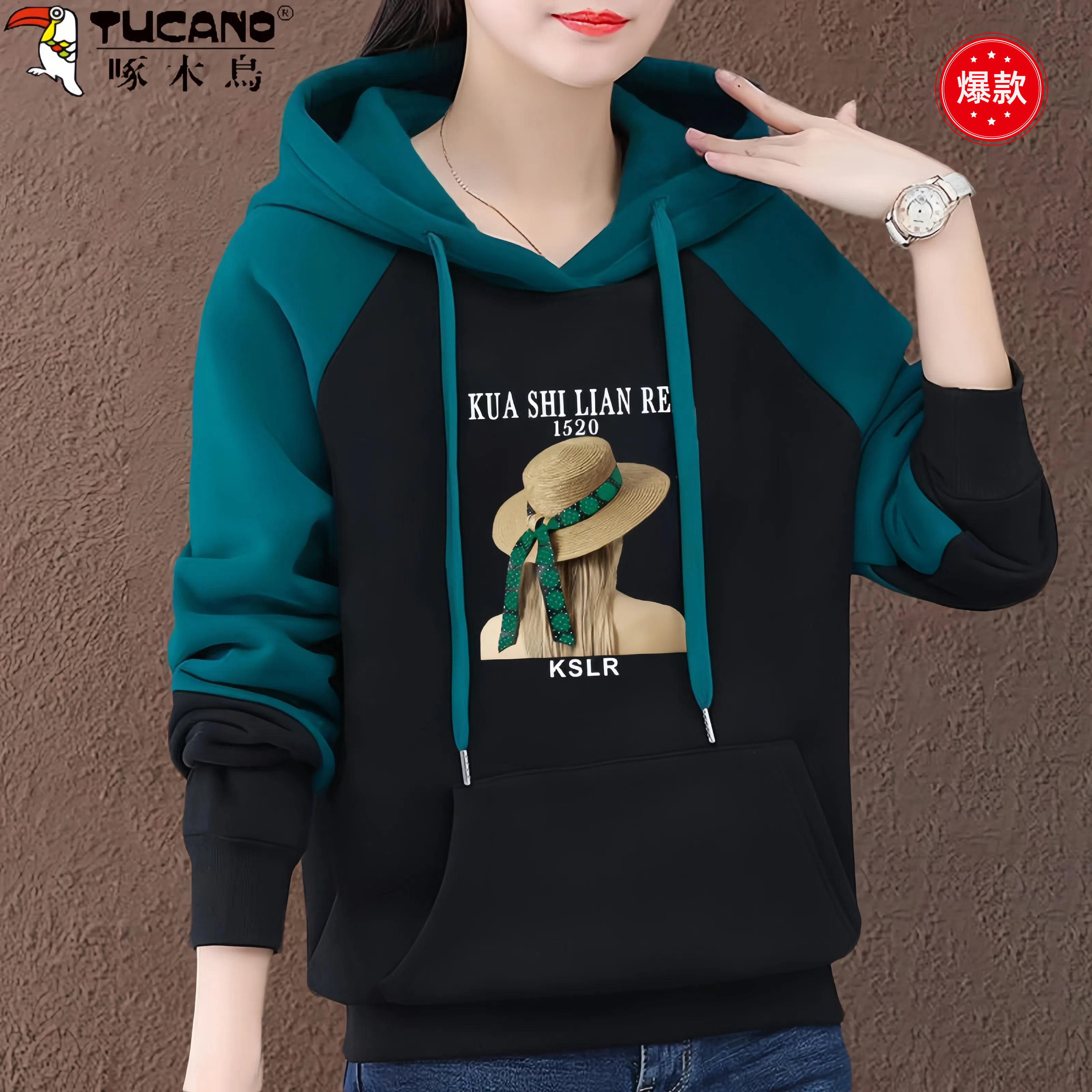 啄木鸟纯棉长袖连帽薄款卫衣女2025秋冬季新款宽松拼接袖子女上衣