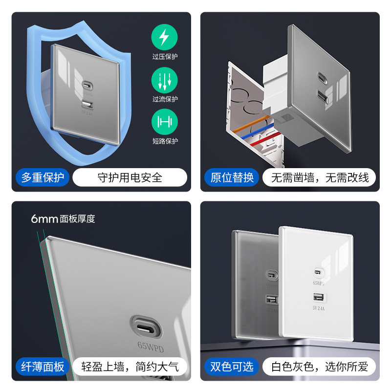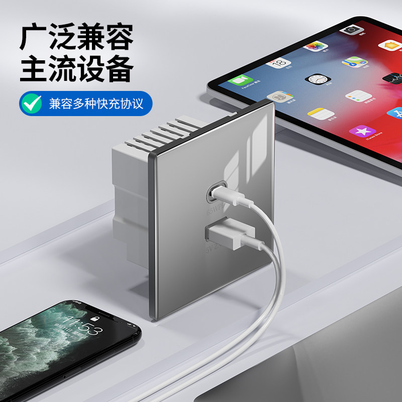 国际电工65W氮化镓快充插座PD双口USB充电器玻璃超薄面板智能兼容