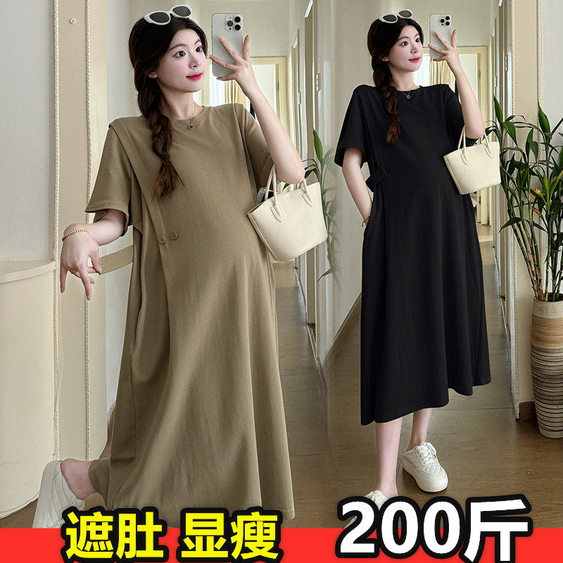 大码孕妇装短袖连衣裙夏装气质遮肚长裙潮妈时尚宽松打底衣200斤
