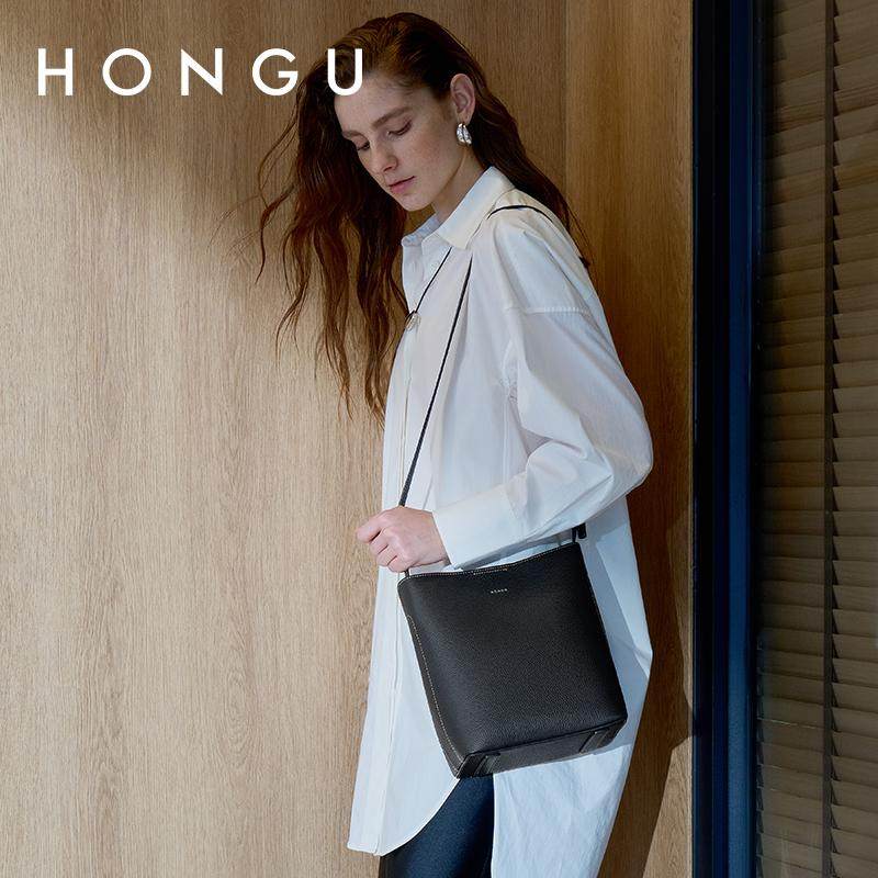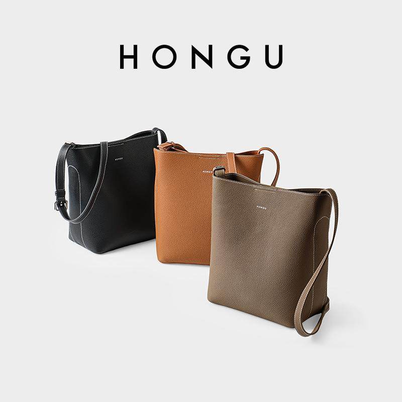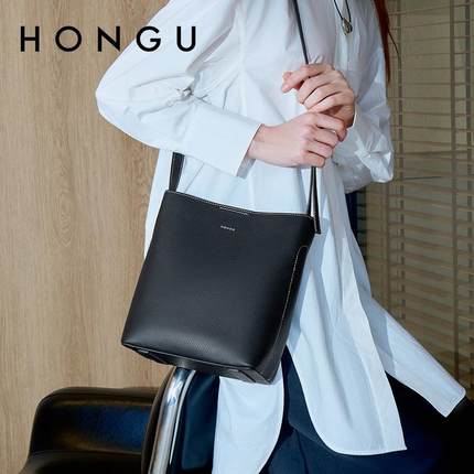 红谷女包牛皮单肩斜挎包休闲大容量水桶包