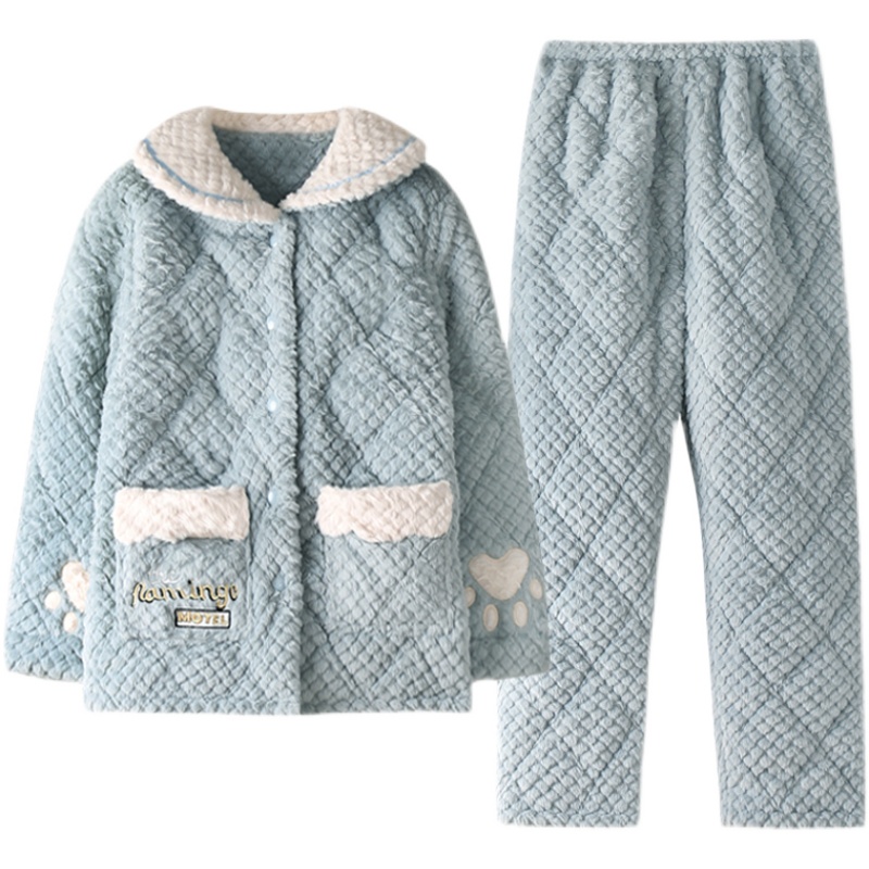 猫人冬季睡衣女秋冬珊瑚绒夹棉加厚三层加绒保暖法兰绒家居服