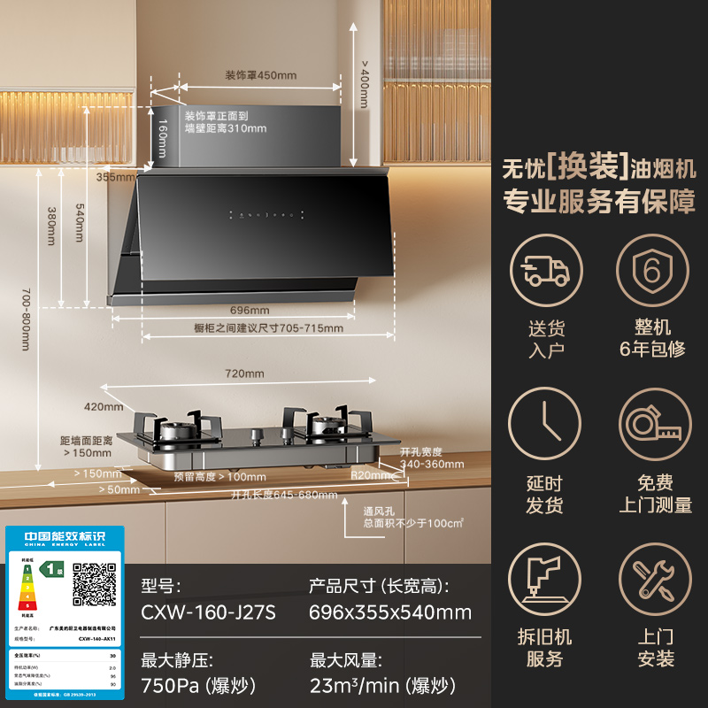 美的官方油烟机J27S燃气灶具套装厨房家用小户型700mm侧吸大吸力