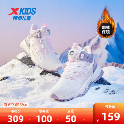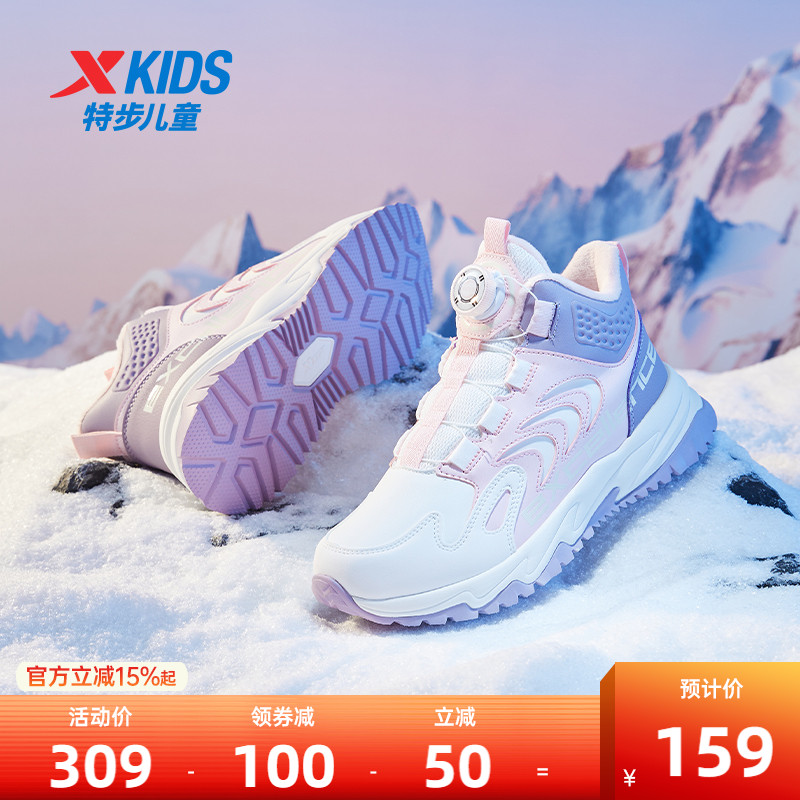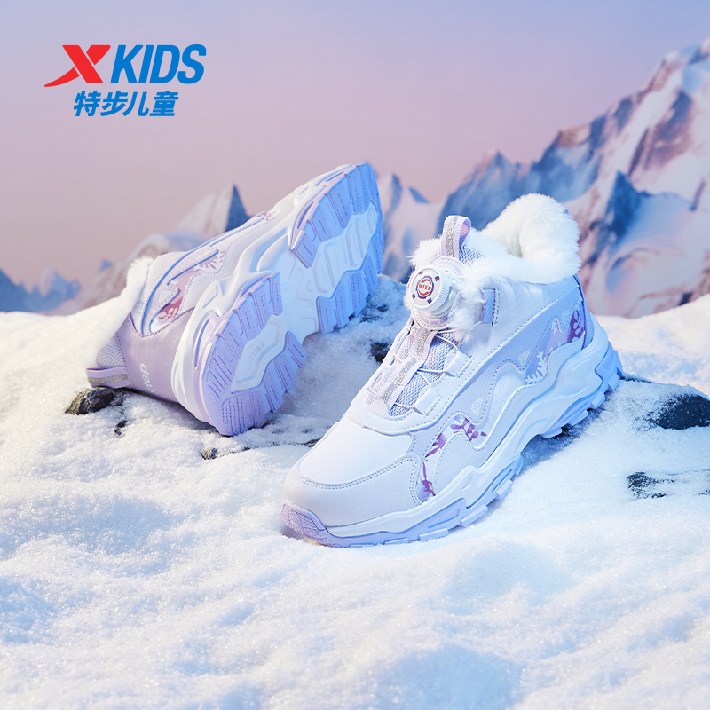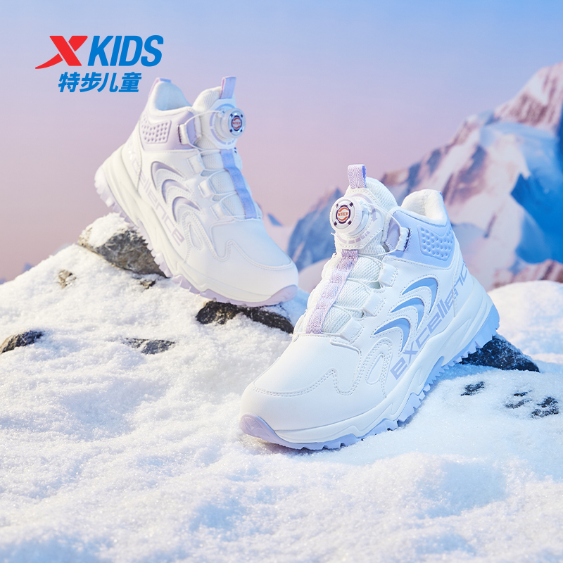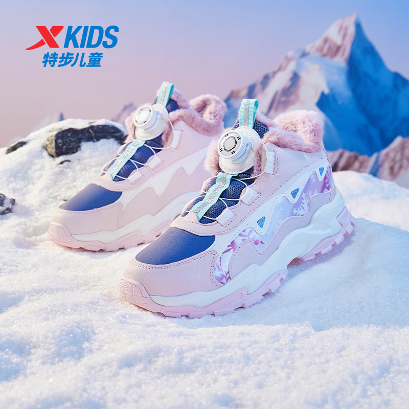特步女童2025新款冬季加绒保暖二棉棉鞋儿童防滑皮面高帮运动鞋子